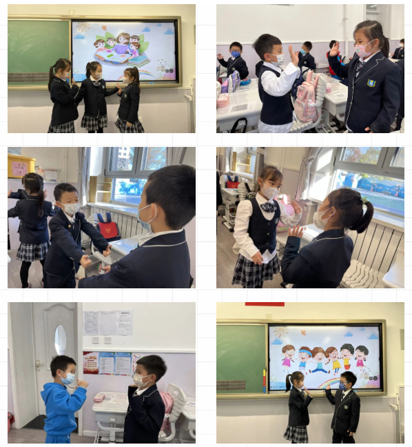文化交往课程群以艺术、语文、英语为主阵地,通过结合生活实际和情景再现的方式,借助“我爱上学”的话题,在真实交际情景中进行交流和表达。同学们自信地扬起笑脸,用中文、英文和自己喜欢的艺术方式介绍自己、同伴和喜欢上学的原因,不仅增强了自信表达的能力,也顺利完成融入了集体的过程。