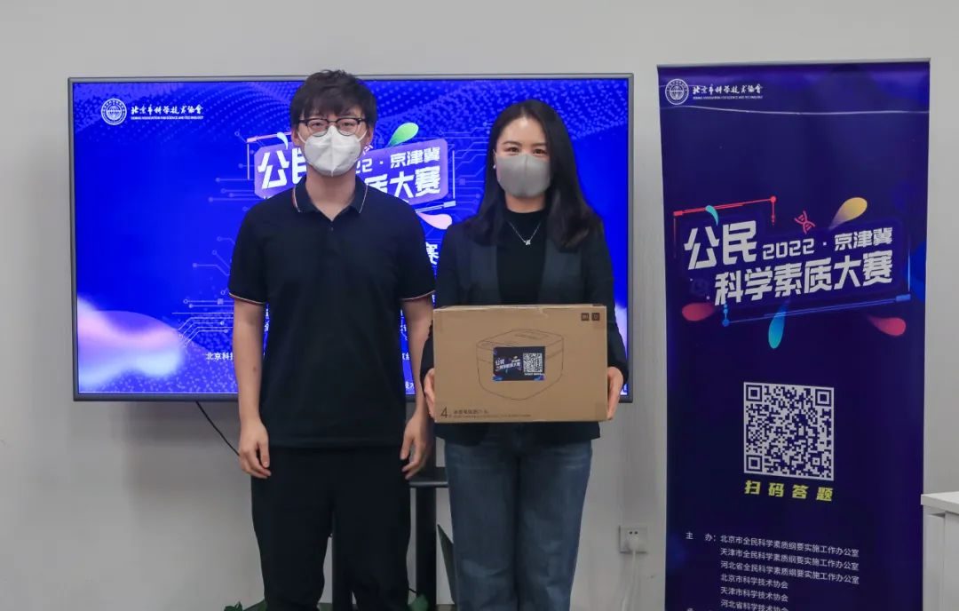 ▲北京经济技术开发区科学技术协会张德铭(左)给一等奖获得者王宇宏颁发奖品(右)