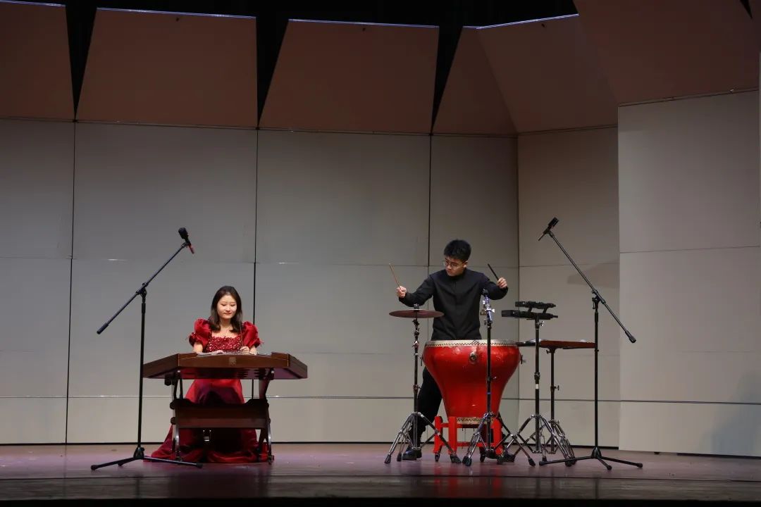音乐会上,我院音乐系、京昆系和宋飞胡琴传承传播中心共同演出了多首戏曲风格浓郁的经典音乐作品。其中既有以地方戏曲为音乐元素创作的扬琴独奏曲《湘墨》、二胡独奏曲《洪湖主题随想曲》、古筝三重奏《汉江韵》、琵琶独奏曲《昭陵六骏》、打击乐独奏《南归》、板胡独奏《红军哥哥回来了》、扬琴重奏《梨花颂》、胡琴重奏《湘韵》第三乐章、戏韵组合《老腔儿》,也有经典民乐作品打击乐合奏《龙腾虎跃》、唢呐独奏《百鸟朝凤》以及二胡现代作品《丝路拾光》,还有在全国第四届青少年戏曲教育教学成果展示活动获得奖项的作品,如慕古组合的京剧选段《捉放曹》、国韵箫韶组合的鼓乐《夜深沉》、南音雅部组合的昆曲选段《玉簪记·琴挑》。