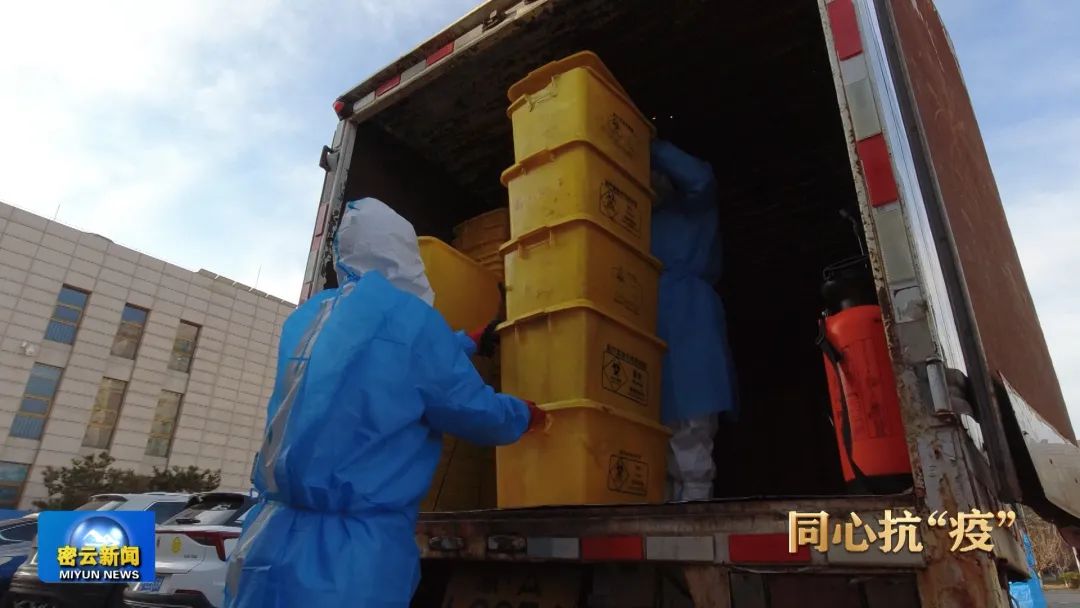 本轮疫情发生以来,密云区各医疗机构、核酸检测点、封管控小区每天产生大量医疗废物需要及时转运处置。为此,区环卫中心成立垃圾处置专班,组建医疗废物运输突击车组,全天 24 小时作业,日收运垃圾量达20吨。