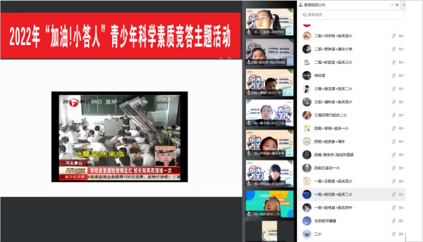 “唐山地震发生在什么时间?震级有多大?天然地震有哪几种不同的类型?全国防灾减灾日具体是哪一天?……”讲座后的竞答环节中,20名学生分为4组进行了线上的互动竞答。