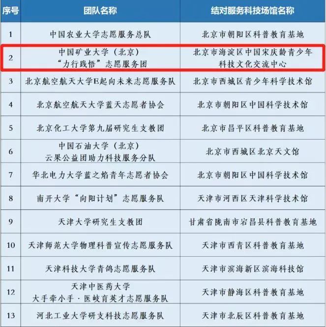 为推动高校大学生科技志愿服务专业化、规范化和常态化开展,团中央青年志愿者行动指导中心、中国青年志愿者协会秘书处联合中国科学技术协会宣传文化部面向全国征集遴选出300支全国大学生科技志愿服务示范团队,中国矿业大学(北京)力学与建筑工程学院“力行践悟”志愿服务团入选。