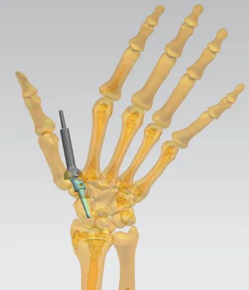 3D打印技术再造拇指并不是直接打印出一个拇指移植到手上,目前医学还无法达到这一步。这个技术的本质,是将双侧手的影像资料数字化,利用电脑软件将伤侧手缺损的部分在健侧手上标记出来,再通过镜影技术将再造所需的部分生成患侧的形状,用3D打印机打印出金属假体,再与自身组织移植结合,从而再造出所需要的人体部位。对于这个患者,需要打印的成分是第一腕掌关节及第一掌骨。