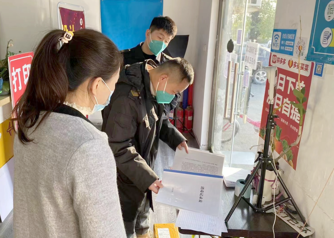 牛栏山市场所工作人员对“七小门店”扫码登记、通风消毒等疫情防控措施落实情况进行检查。