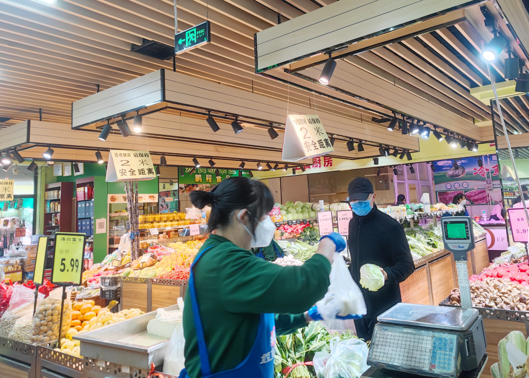 鑫绿都生活超市(安纳湖店)内,工作人员和顾客自觉佩戴口罩。