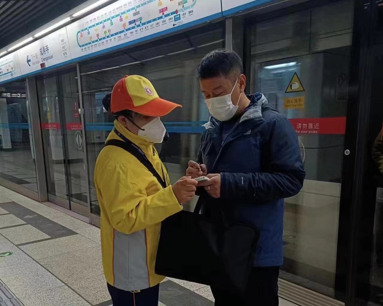 天气转冷,近几天北京笼罩在大雾中。当前北京疫情正处于高发期,成寿寺文明引导员中队全体坚守岗位,冲锋“疫”线,以饱满的热情,积极引导大家争做文明有礼的好乘客,传递社会和谐的正能量。在地铁站,队员们组织乘客排队候车,时刻提醒乘客保持一米距离有序上下车,提醒乘客全程佩戴口罩,做好自我防护,鼓励乘客坚持绿色出行,帮助行动不便的老人、孩子和需要帮助的乘客上下车,为看不懂线路图的乘客答疑指路。