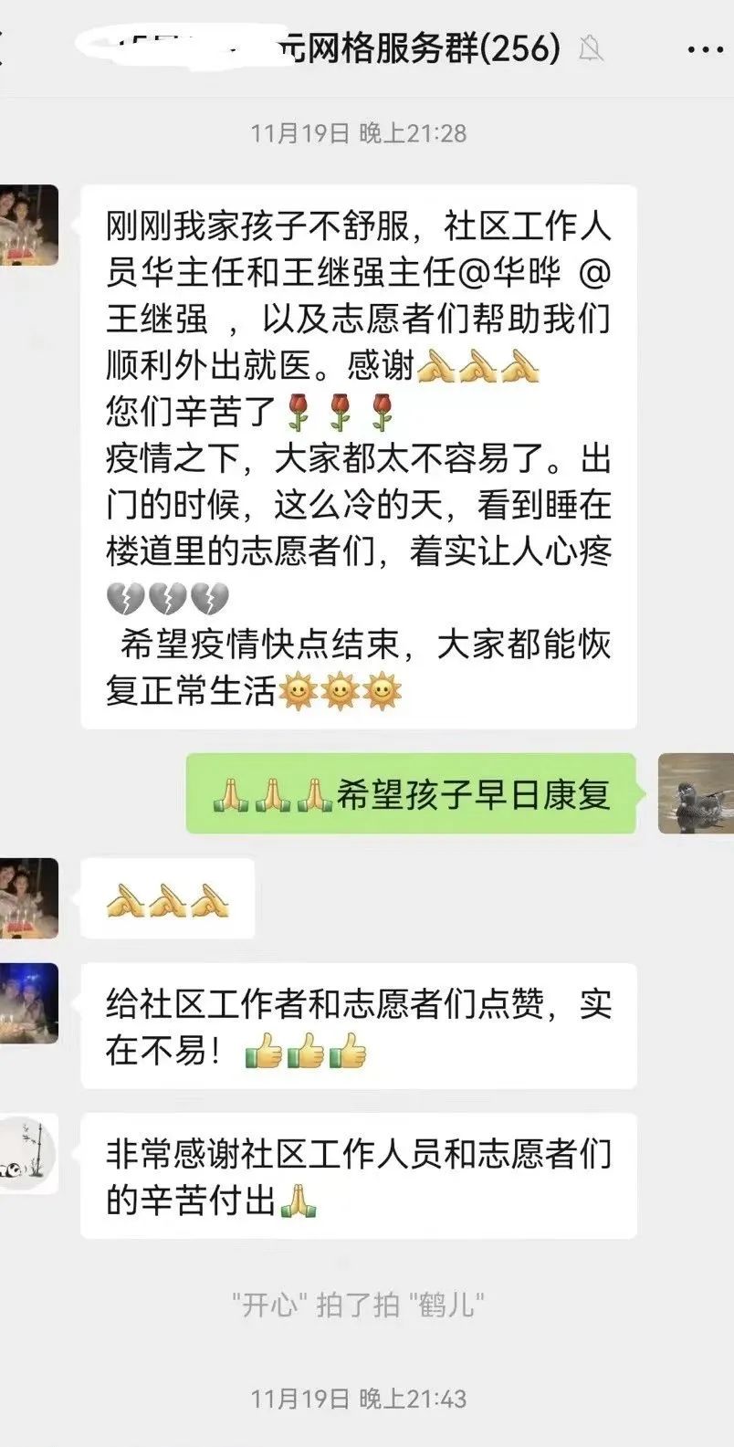 “谢谢你们以及志愿者帮助我们顺利外出就医,你们辛苦了。这么冷的天,看到睡在楼道里的志愿者们,着实让人心疼。”孩子情况好转后,居民在微信群里向居委会表达了感谢之情,并且还录制了一首孩子唱给工作人员的《听我说,谢谢你》歌曲。