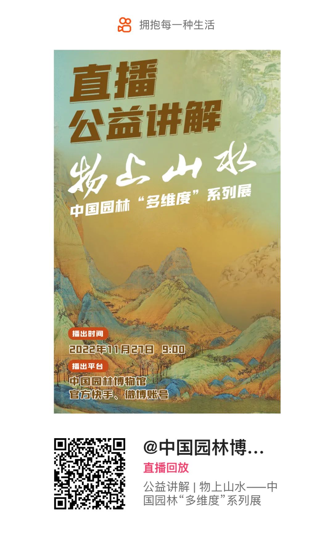 直播将在——中国园林博物馆官方快手、微博@中国园林博物馆同步播出,长按识别二维码即可线上观看!
