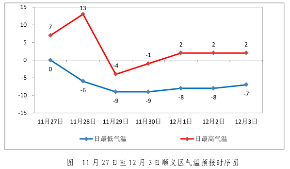 最高气温有望跌破近十年同期最低值(近十年11月下旬同期顺义气象站白天最高气温的最低值为-2.9℃,出现在2015年11月24日;夜间最低气温的最低值为-11.2℃,出现在2015年11月26日)。