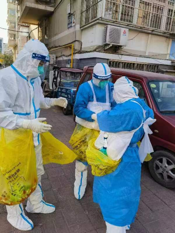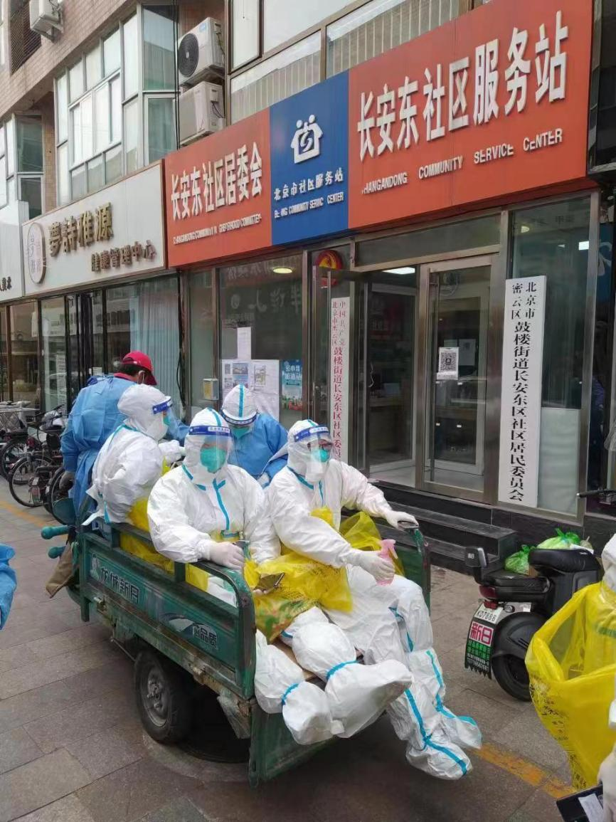 高风险社区工作者每天需要为上百户居家隔离居民进行上门核酸检测。据支援长安东区的下沉干部黄湘钦介绍,“由于长安东区地处密云城区中心商业街附近,楼上是住户,楼下有底商,来往人员交叉混杂,每天看似简单的爬楼入户做核酸,其过程事实上比大家想象的复杂。”“我们都经过医院的专业培训,自我防护工作是放在第一位的。我们会及时消杀,更换防护服,避免二次传播风险。这‘一脱一穿一消杀’,虽然费些时间,但却保证了入户全过程的安全性。”