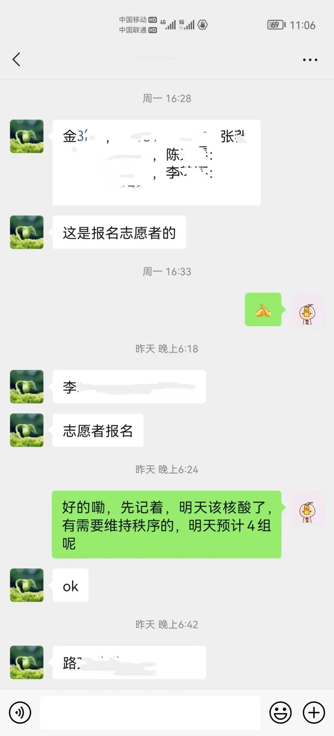 “我报名!”“我在家也没事,想为防疫出份力。”临时封控当天,枣园东里北区社区在居民群里发起了储备志愿者报名通知,居民金晓华和张薇看到信息后第一时间报名。