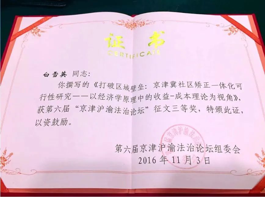 纵观白雪英的研究成果,不难发现“京津冀”是一个高频词汇。从2016年到2021年,她连续6年都在关注“京津冀社区矫正一体化可行性研究”这一课题,以京津冀三地社区矫正为样本,从经济学视角探讨三地社区矫正一体化后的成本及收益,并从制度层面进行可行性设计,所撰写的论文先后被收录第三届京津冀司法论坛论文集、第四届京津冀司法论坛论文集及第六届京津沪渝法治论坛论文集,对加强京津冀司法协作具有很强的理论及实践指导意义。