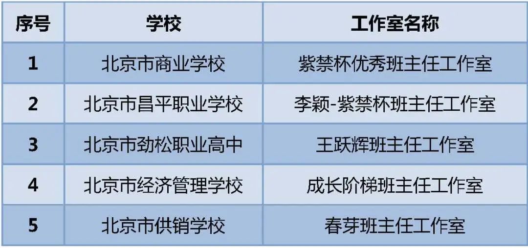 近日,为深入贯彻全国职业教育大会和北京市职业教育工作会议精神,进一步深化中等职业学校“三全育人”综合改革,加强班风、学风、校风建设,提高学生管理和德育工作水平,市教委组织开展了班主任工作室培育建设工作和首批北京市中等职业学校名班主任工作室遴选工作。经学校推荐申报、专家遴选等程序,确定北京市商业学校紫禁杯班主任工作室等5个工作室为首批北京市中等职业学校名班主任工作室。