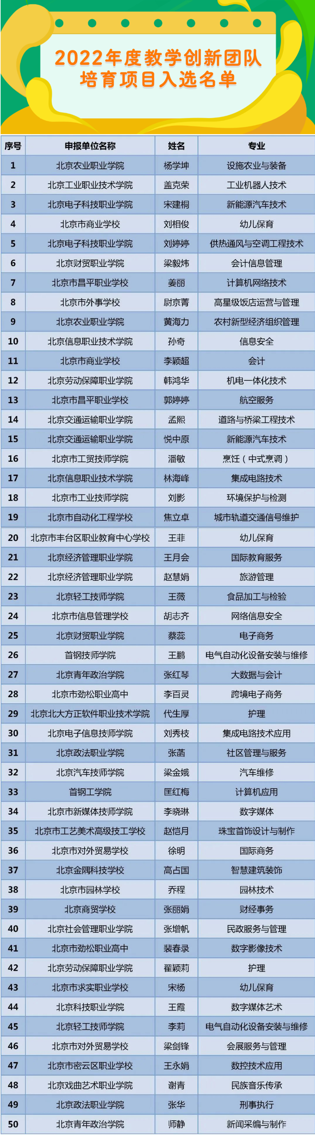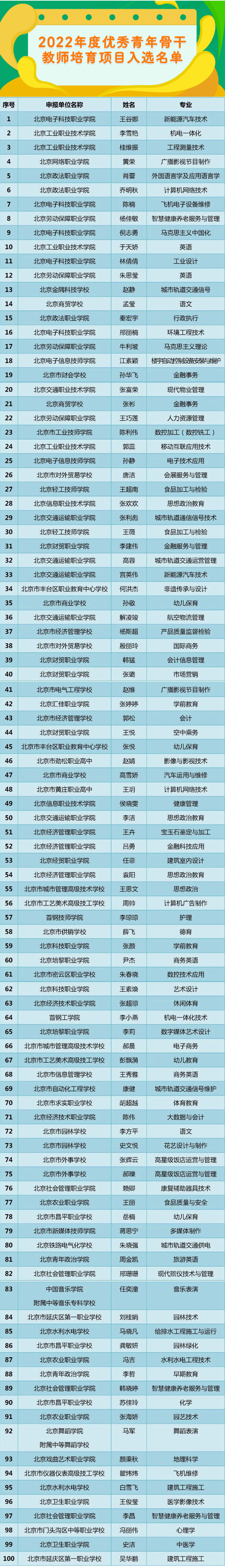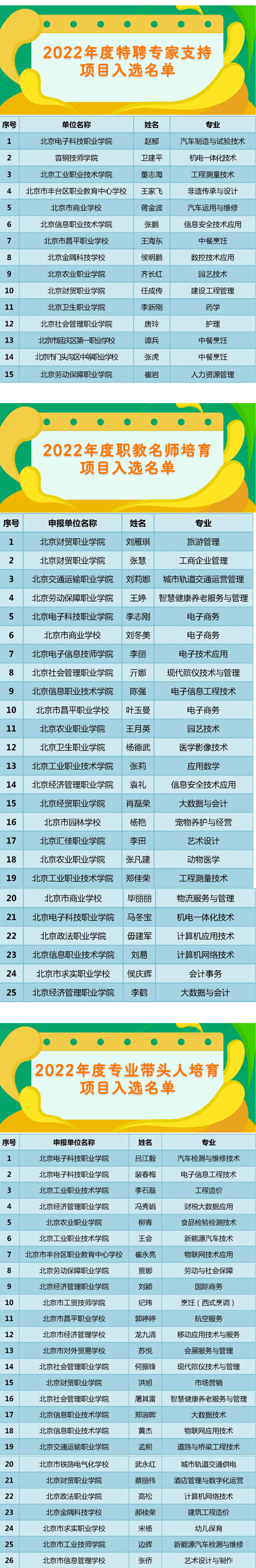 同时,根据市教委、市财政局《关于印发〈“十四五”时期北京市职业院校教师素质提高计划〉的通知》文件精神,在学校推荐和专家评议的基础上,经北京市职业院校教师素质提高计划领导小组审定,评选出了2022年度特聘专家支持项目、职教名师培育项目、专业带头人培育项目、优秀青年骨干教师培育项目和教学创新团队培育项目名单。