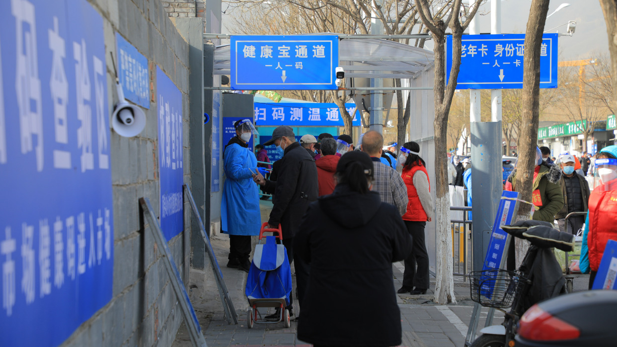 记者在鑫源市场门前看到,4名工作人员在查验北京健康宝后,正有序引导市民通过电子测温区进入市场,同时,市场还安排了专人,对场内外环境进行消杀。
