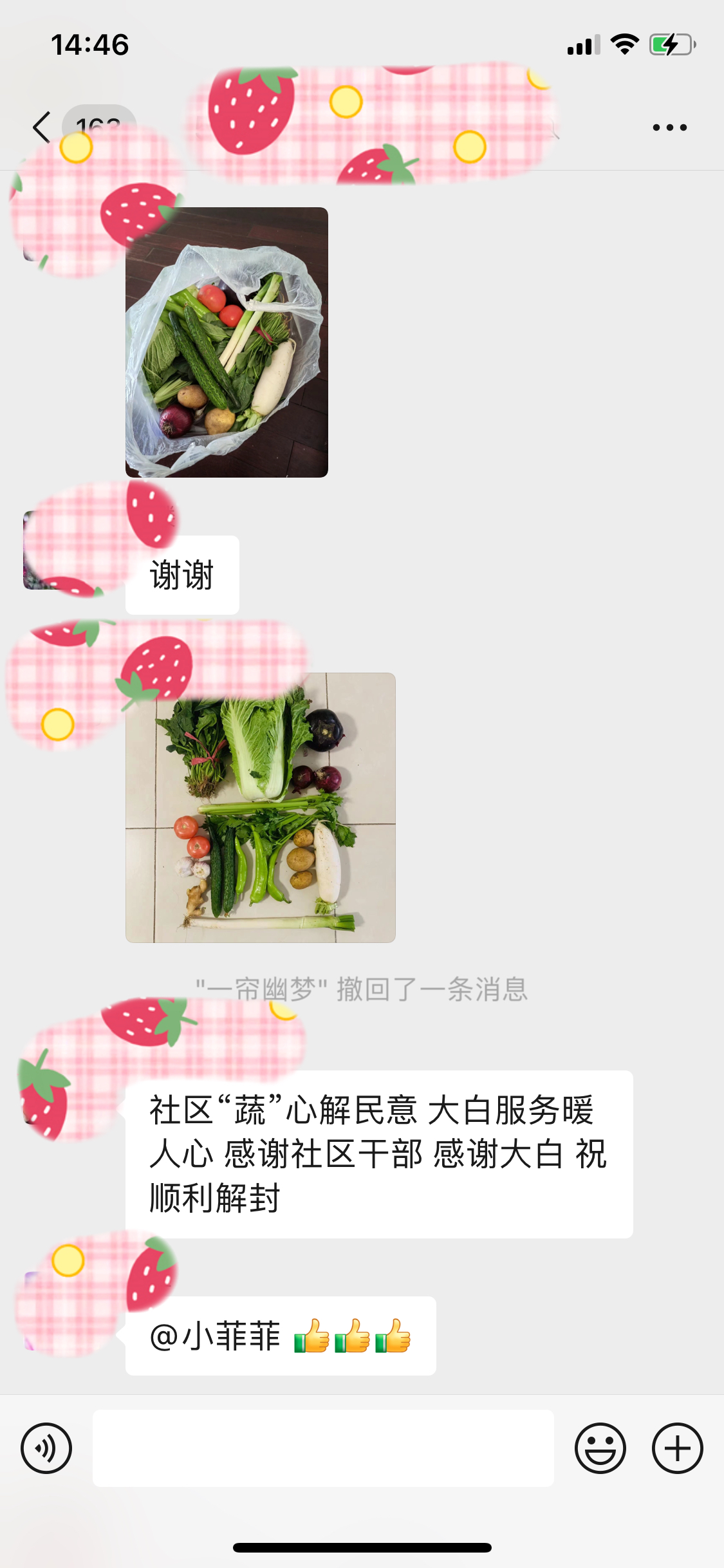 社区“蔬”心解民意,大白服务“包”满意。上午9时,丰台区东铁匠营南方庄社区2号院的隔离居民群里热闹了起来。“大家别着急,我们先收垃圾,之后消毒,然后会挨家挨户地送上蔬菜大礼包。”张秀萍在群里通知被封控的居民。