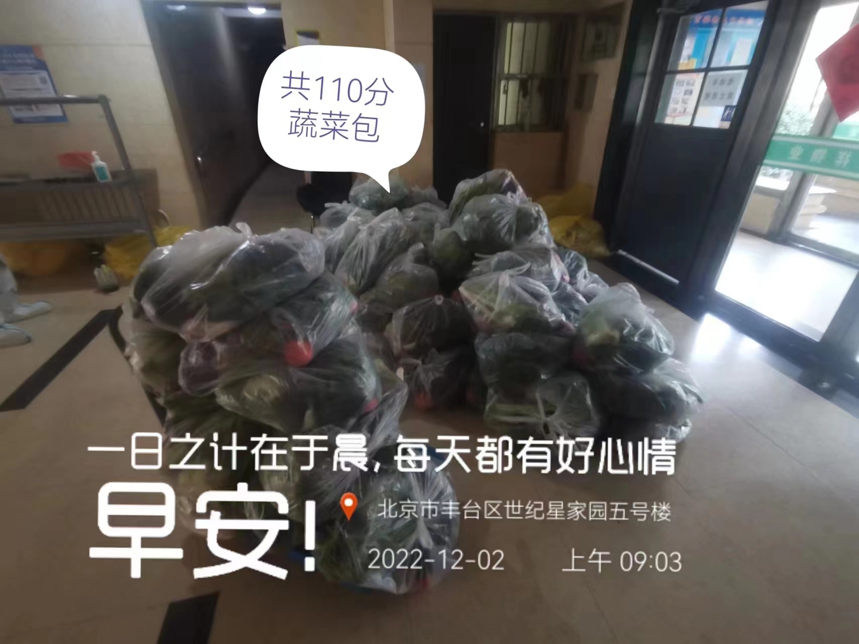 12月2日,东铁匠营街道南方庄社区居委会书记张秀萍在业主群中发了一张照片,110份蔬菜大礼包整整齐齐地摆放放在楼下的走廊里等待配送。临近大雪节气,民间有“大雪吃三白”的说法,这三白就是指的是三种白色的食物,比如大葱,白菜,还有萝卜。东铁匠营街道精心挑选蔬菜种类,蔬菜包里不仅有“三白”还有,葱、姜、蒜、芹菜、白菜、西红柿、茄子等十四五样蔬菜。