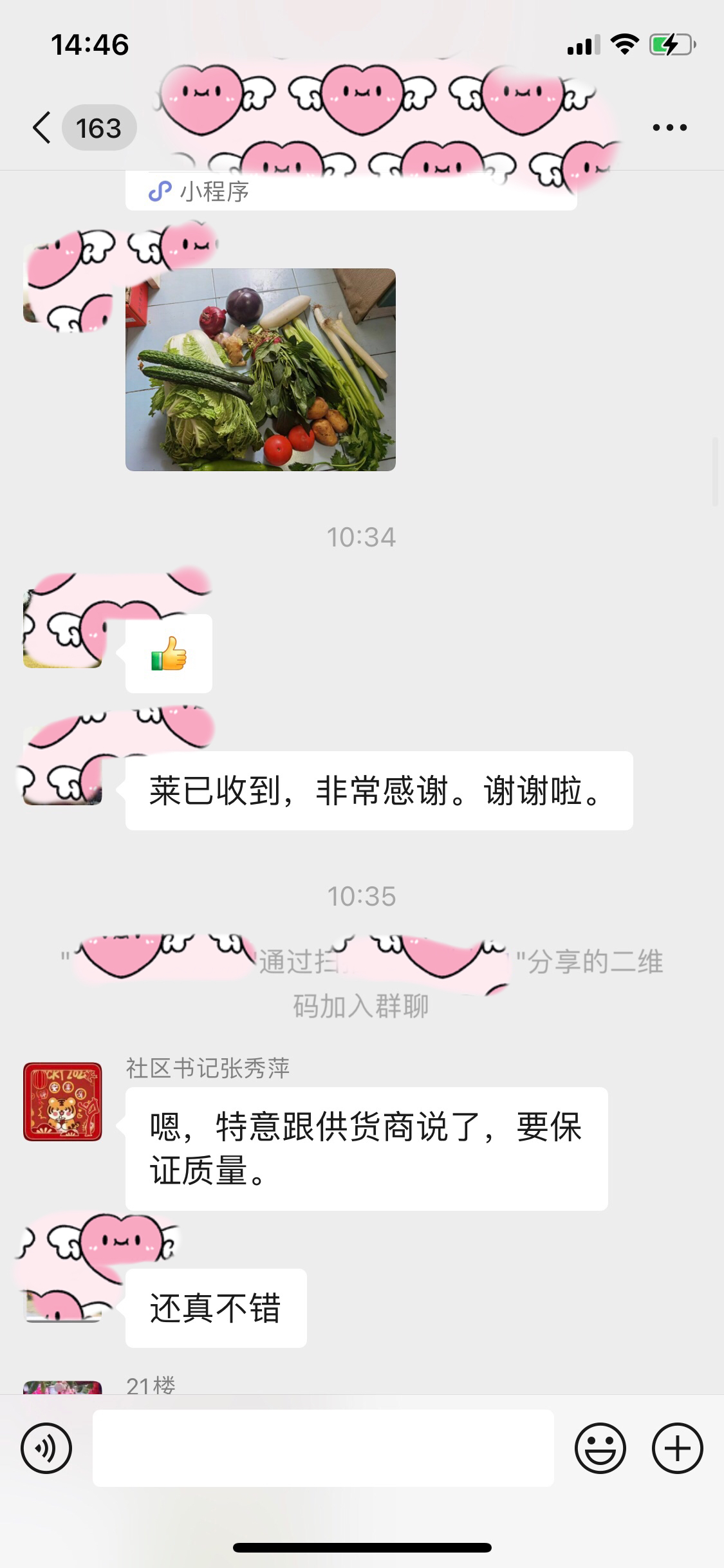居民闫小菲女士说:“其实挺理解社区工作者和物业人员,他们每天上楼收垃圾、做消毒本身已经很不容易了,没想到还收到了爱心的大礼包,都感觉挺不好意思的。今天正好是隔离的第四天,家中的蔬菜已经吃得差不多了,送到了心坎里,从收到礼包来看,蔬菜十分新鲜,希望疫情早些过去,让社区志愿者和物业人员好好歇歇,他们实在太辛苦了。如果条件允许,小区以后再出现需要时,我也希望去做志愿者,帮他们分担一下。”