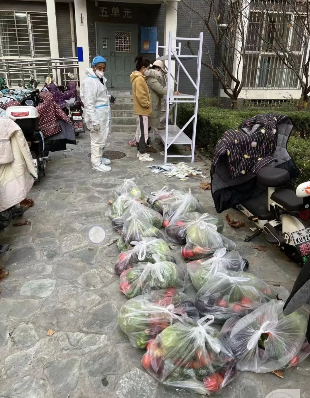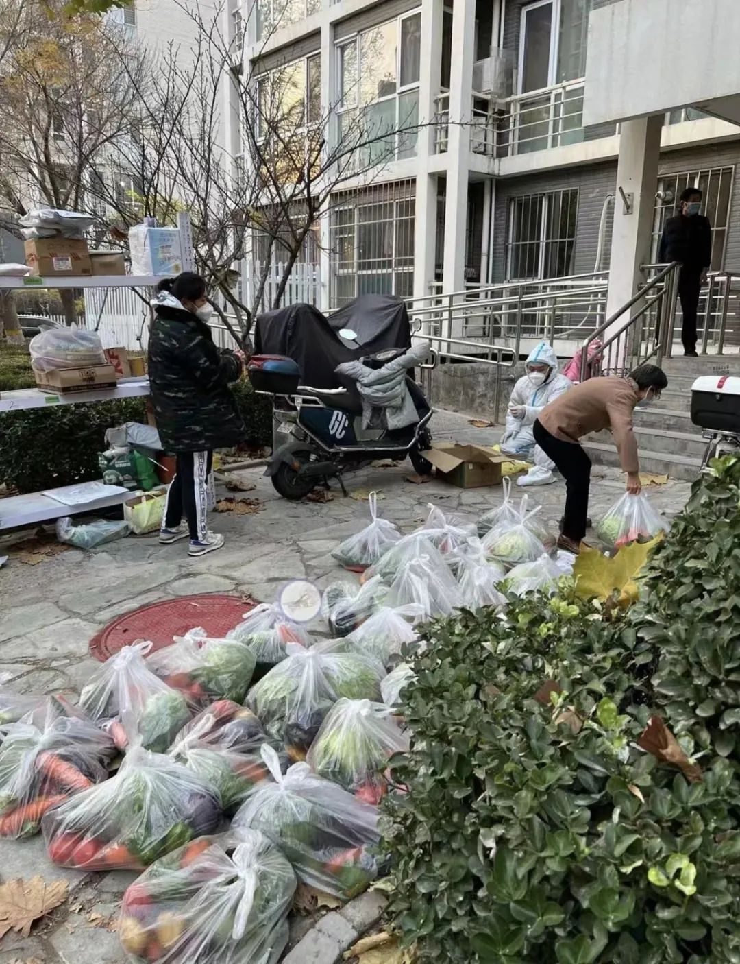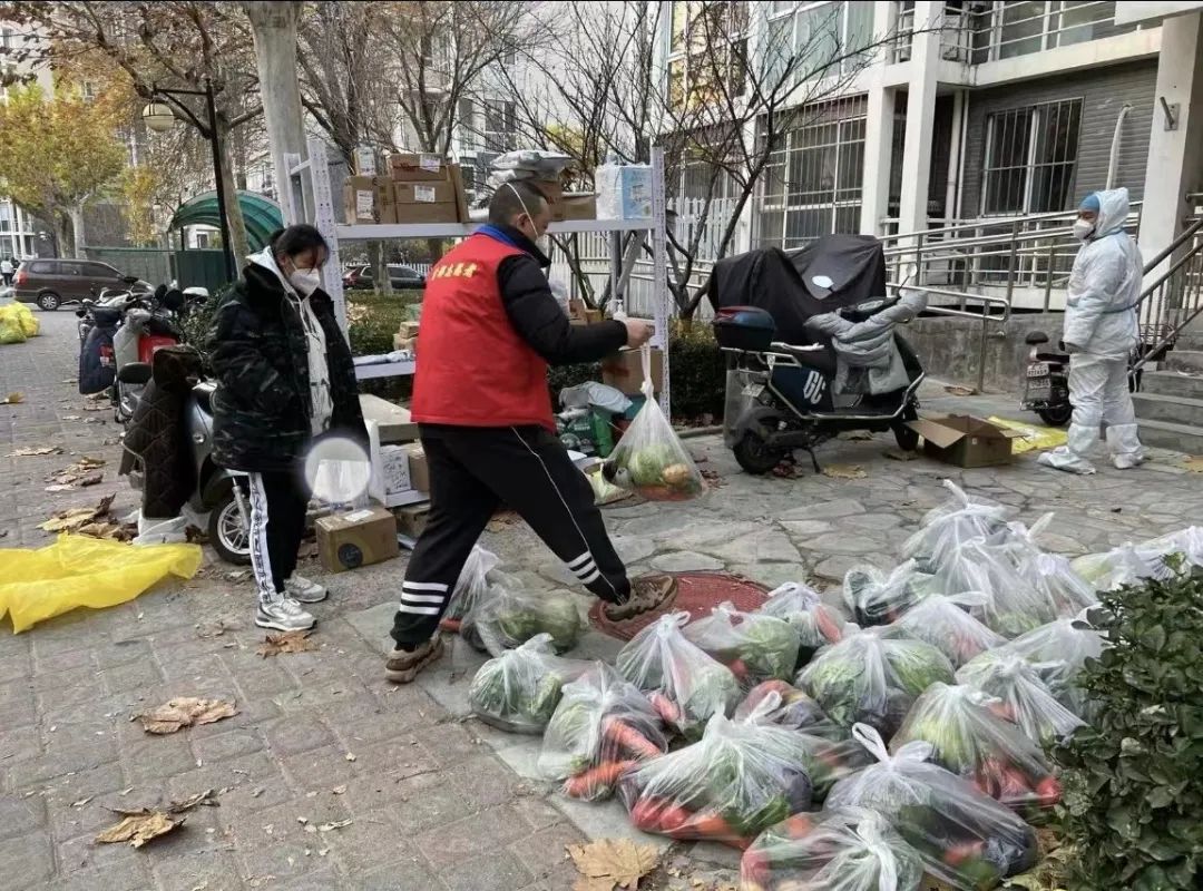 为保障居民们的日常生活,新龙城西区社区为每户居民发放了蔬菜包。待市场采购的蔬菜运送至指定位置后,社区工作人员、物业工作人员、网格员和社区志愿者们,立即开始清点、分拣、装袋。