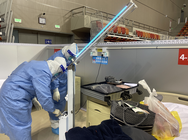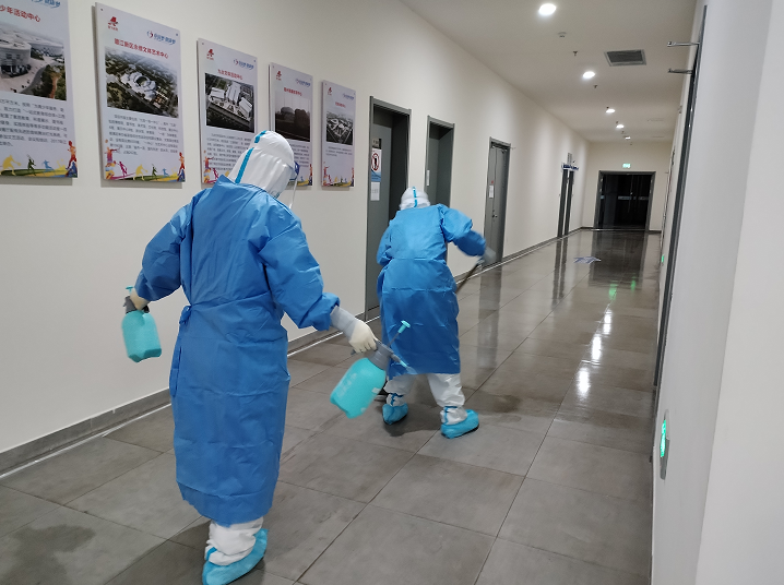 每天晚上10点后,方舱里患者休息了,负责方舱运维和保洁的工作人员则忙碌起来,他们要把患者居住区外的公共区域整体再消杀一遍。喷壶、拖布、消毒湿巾……工作人员身着防护服,拿着各种消毒设备,认认真真一个部位一个部位地消杀。