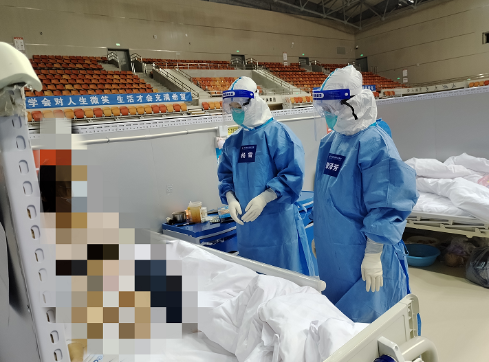 在方舱医院,每名医护人员都是多面手,身兼数职。一早一晚查看体温监测,询问患者身体状况,测量脉搏血压,定时进行血氧饱和度监测等,密切观察患者病情变化。