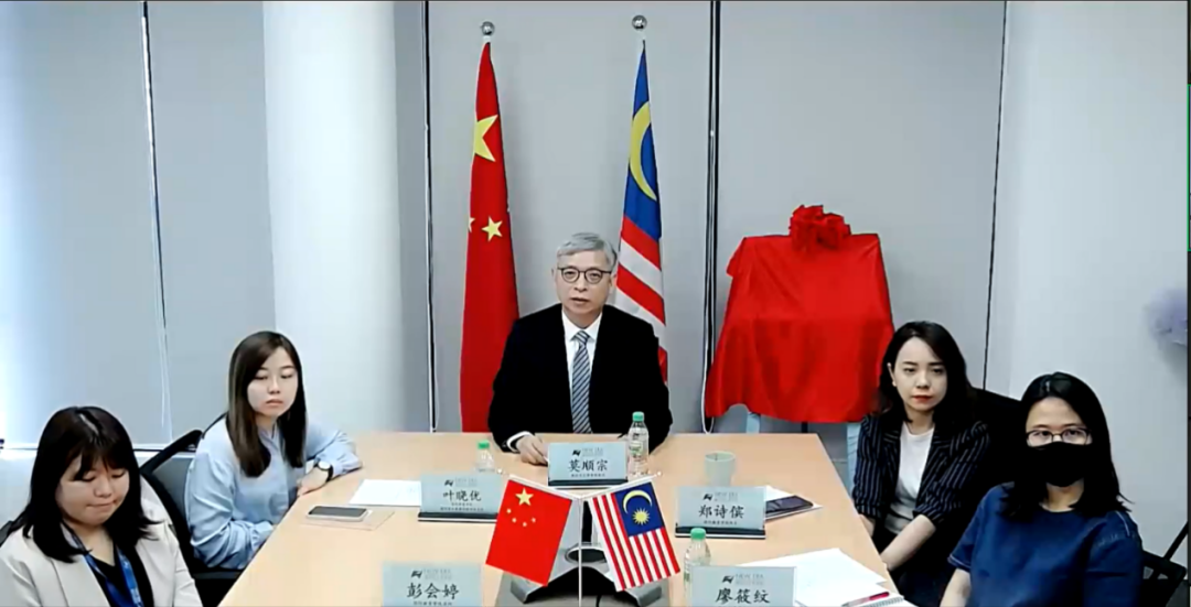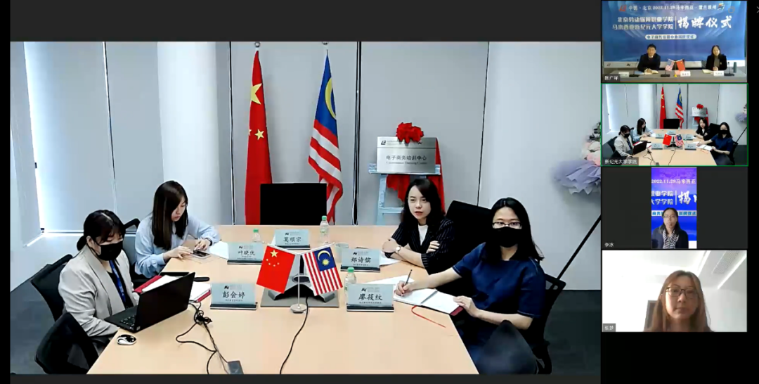 双方校领导致辞结束后,北京和马来西亚会场同步为电子商务培训中心揭牌,并通过钉钉会议合影留念。
