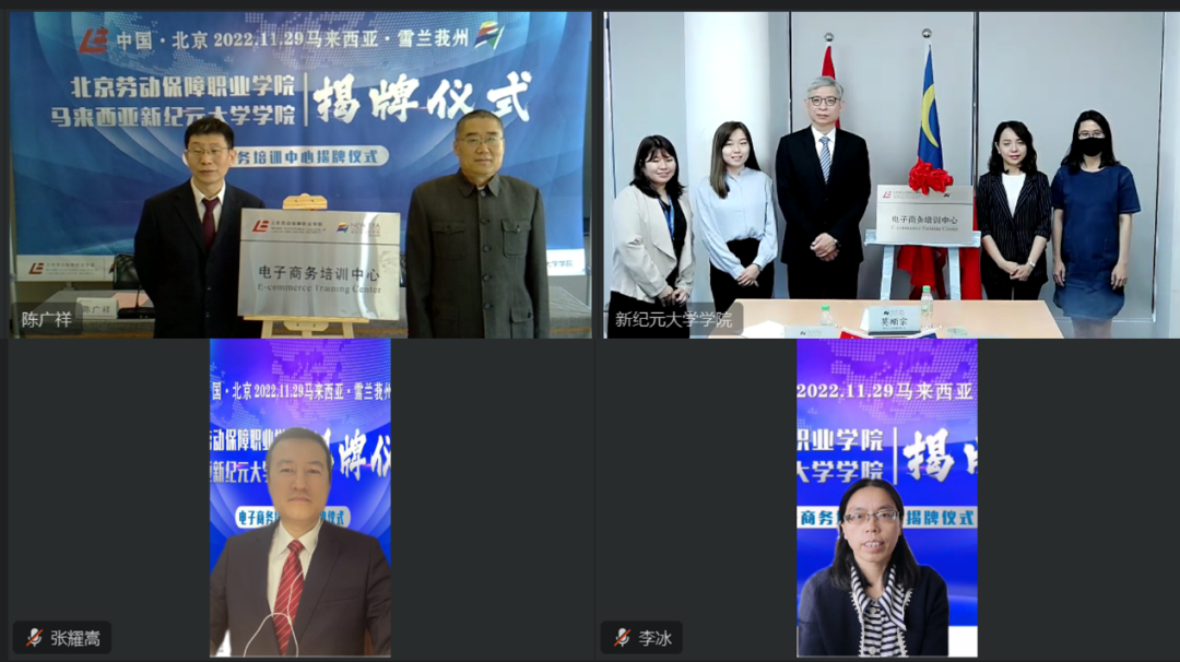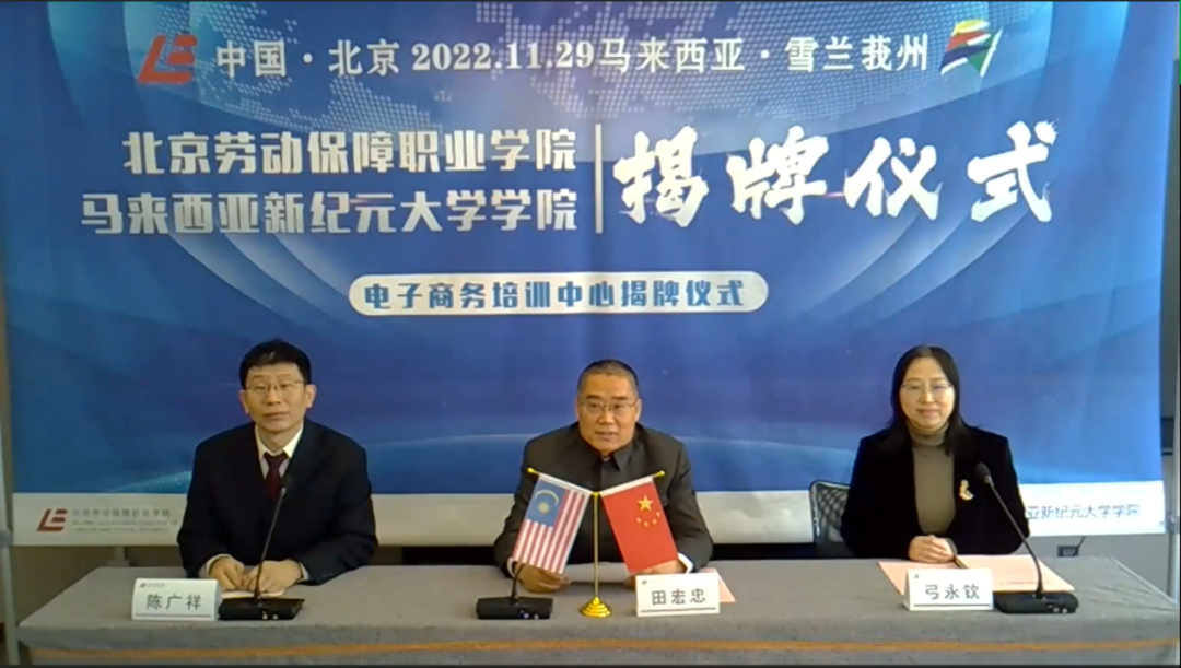 2022年11月29日上午,我校与马来西亚新纪元大学举行了电子商务培训中心线上揭牌仪式。新纪元大学学院校长莫顺宗、国际教育学院院长郑诗傧、国际教育学院国际专业发展与培训处主任叶晓优、电子商务培训中心项目负责人彭会婷和助理教授廖筱纹在马来西亚现场参加会议。北京劳动保障职业学院院长田宏忠、副院长张耀嵩、国际教育学院院长陈广祥、国际教育学院副院长弓永钦、电子商务专业教师李冰和外事专员张梦分别在现场和线上出席揭牌仪式,陈广祥主持了揭牌仪式。