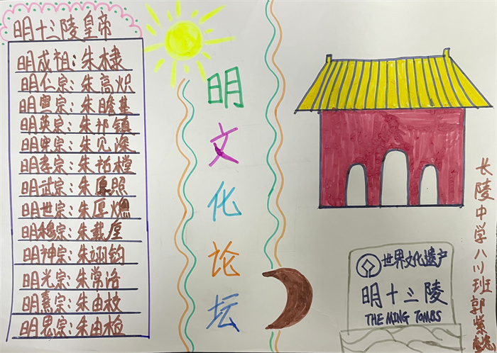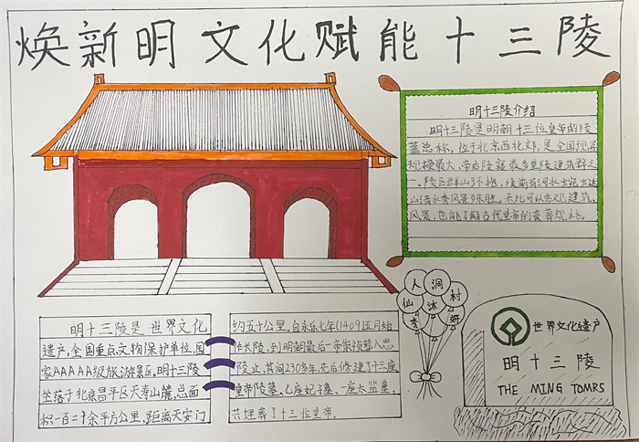 为深化明史、明文化研究,进一步推动优秀传统文化活态传承和文物活化利用,迎接即将开幕的2022明文化论坛,十三陵镇向辖区儿童及青少年发起优秀手抄报征集活动,汇聚孩子们对十三陵的美好祝福。