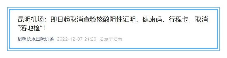 根据国务院联防联控机制相关规定,即日起,昆明机场取消查验进出港旅客的核酸阴性证明、健康码、行程卡,进港旅客不再进行落地核酸检测。
