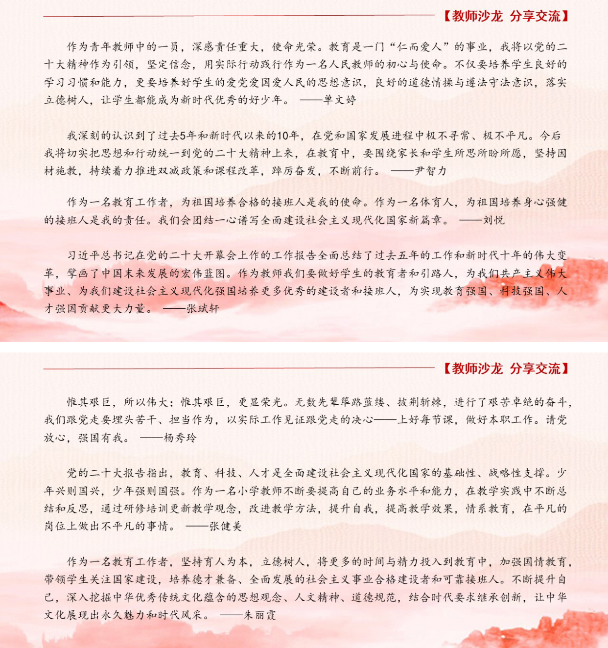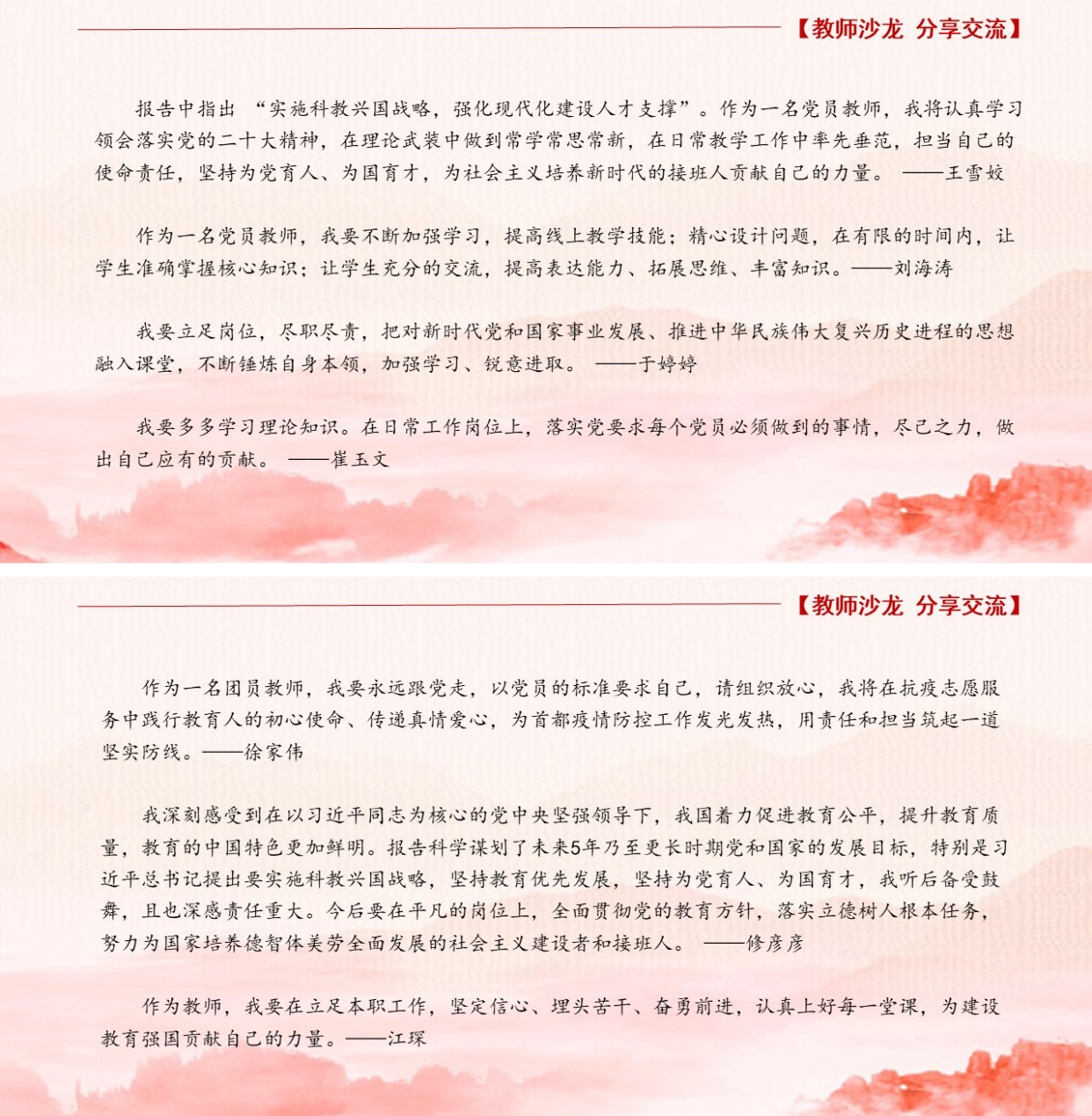 通过学习研讨和交流活动,全体教师深刻领会党的二十大报告关于教育的新定位新部署新要求,学校将在集团党委的引领下,充分发挥党支部战斗堡垒作用,强化政治引领,使党的二十大精神进一步形成教育教学生动实践,共同携手筑牢师生防疫屏障,不断踔厉奋发、勇毅前行。