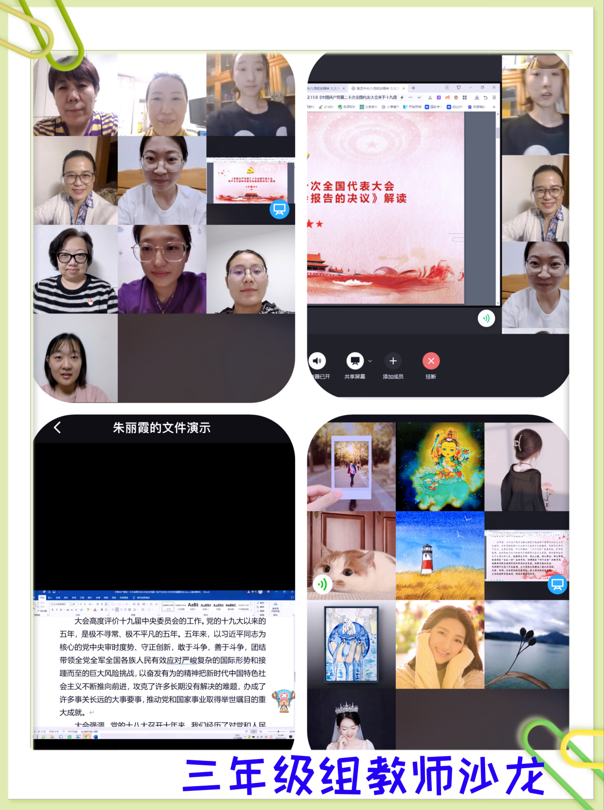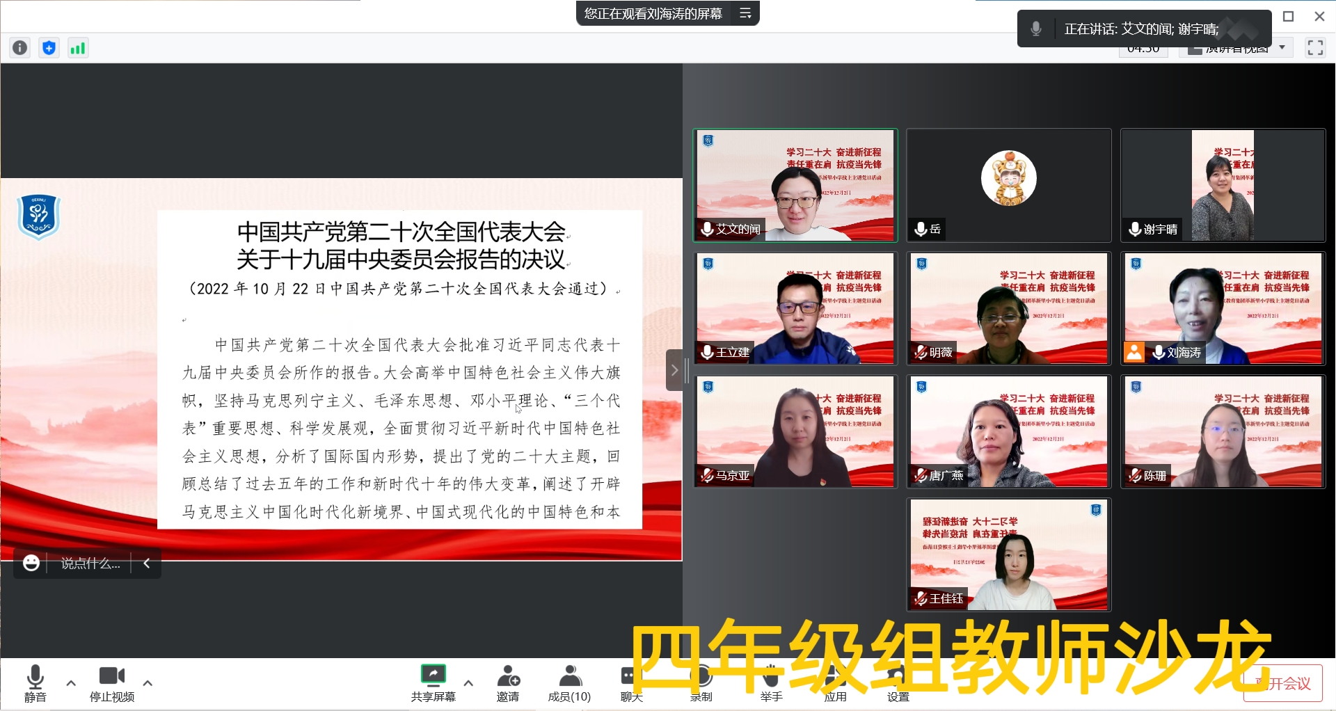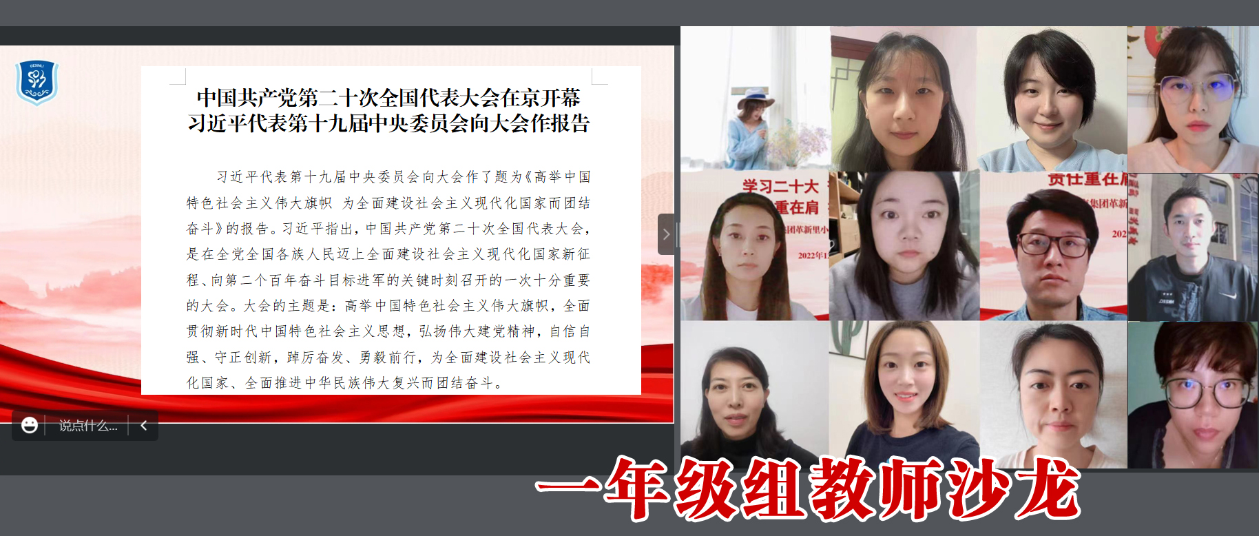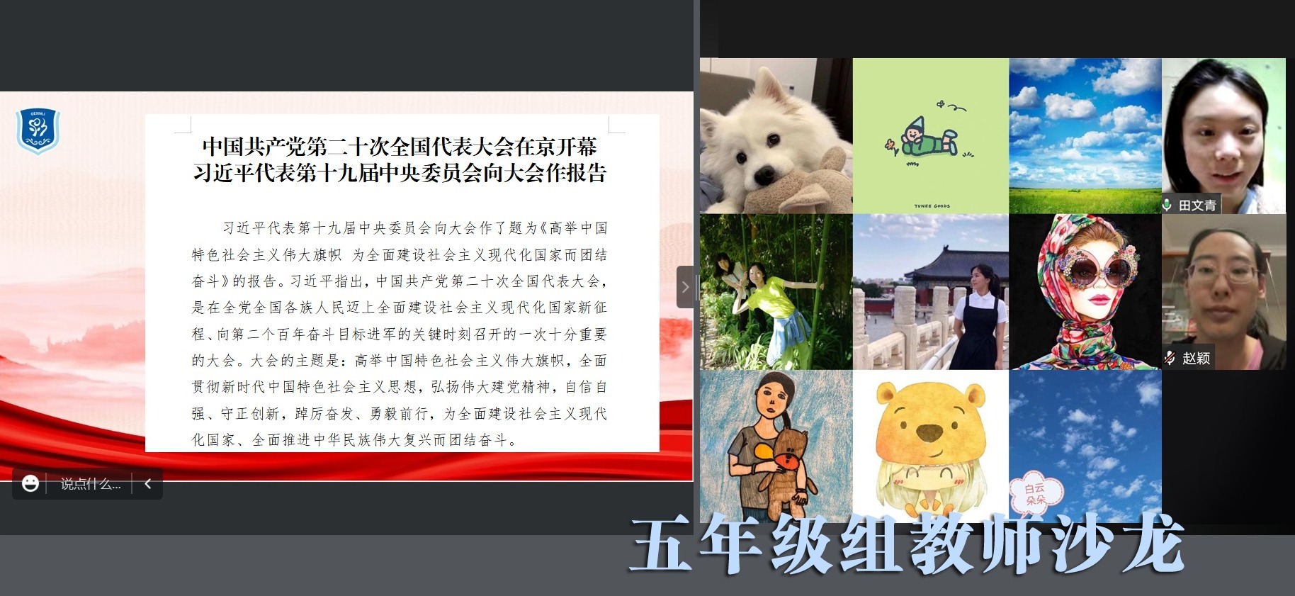 全体教师相聚云端,王欢校长、姚辉副书记向老师们传达区教工委会议精神,学习《习近平在参加党的二十大广西代表团讨论时强调心往一处想劲往一处使推动中华民族伟大复兴号巨轮乘风破浪扬帆远航》,老师们认真学习记录并结合自己实际工作和当前疫情形势,积极分享自身感受。