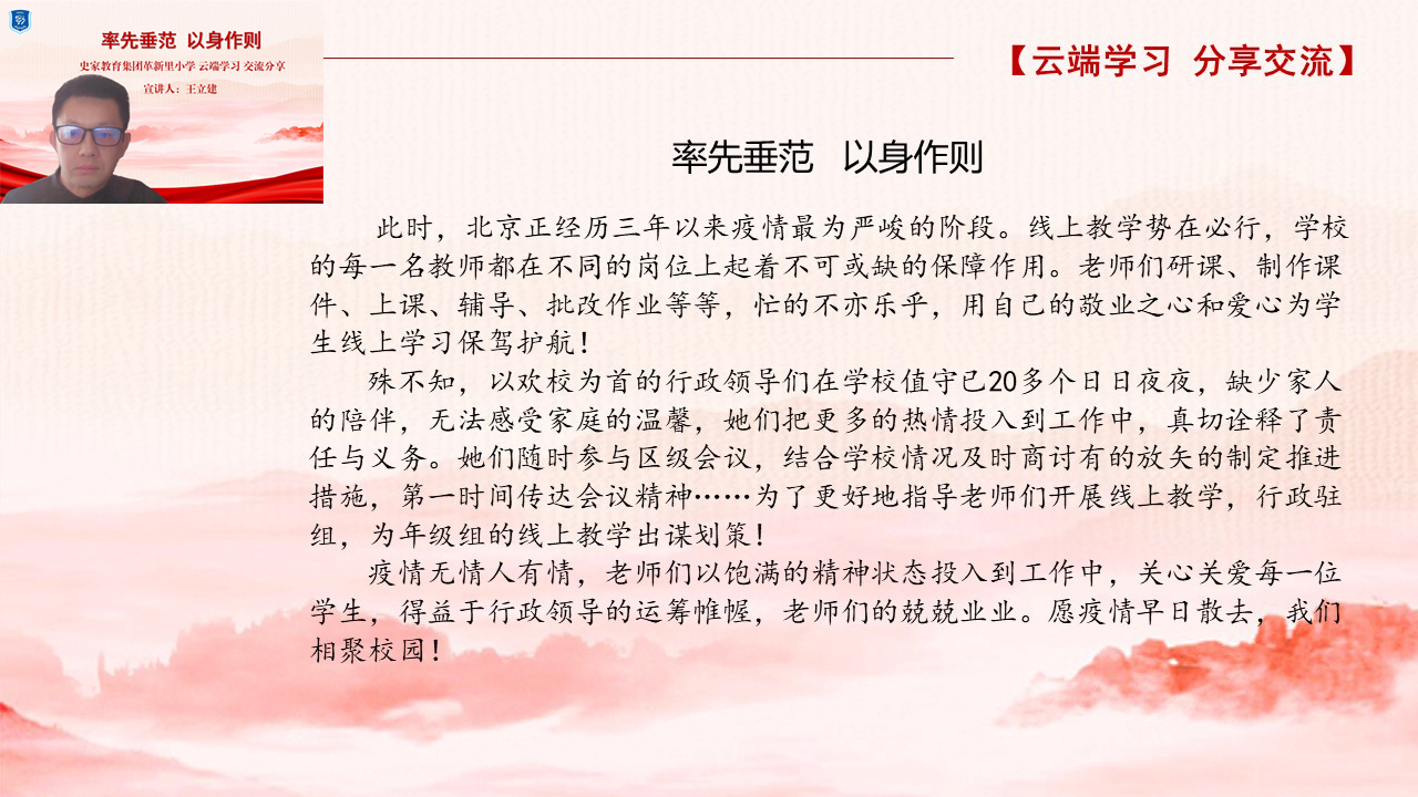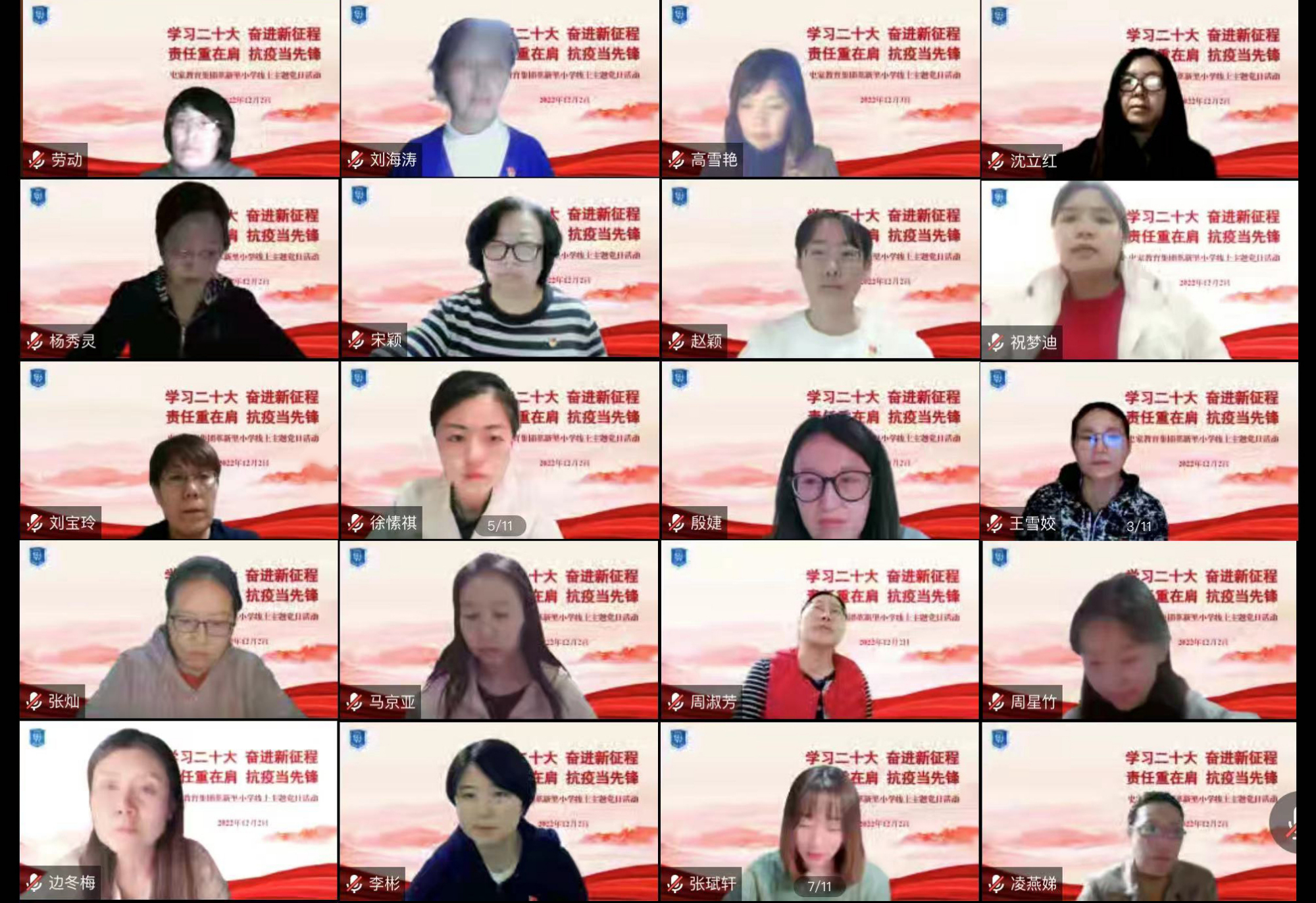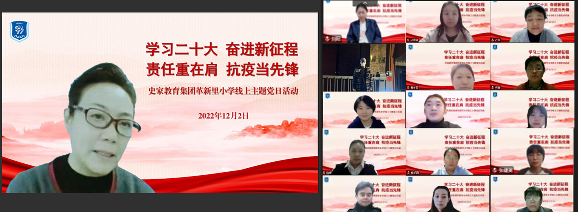 育人为师,抗疫为士。战疫时刻,革新里小学党支部高度重视,在集团党委的引领下,第一时间积极响应上级疫情防控工作精神,认真贯彻落实区委组织部及区委教育工委《关于东城区教育系统在疫情防控工作中广泛开展“责任重在肩 抗疫当先锋”活动的通知》精神,于12月2日至3日,组织开展“学习二十大 奋进新征程 责任重在肩 抗疫当先锋”线上主题党日暨三个“一”活动,全体教师积极参与。