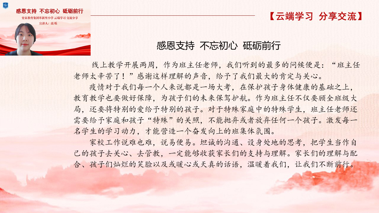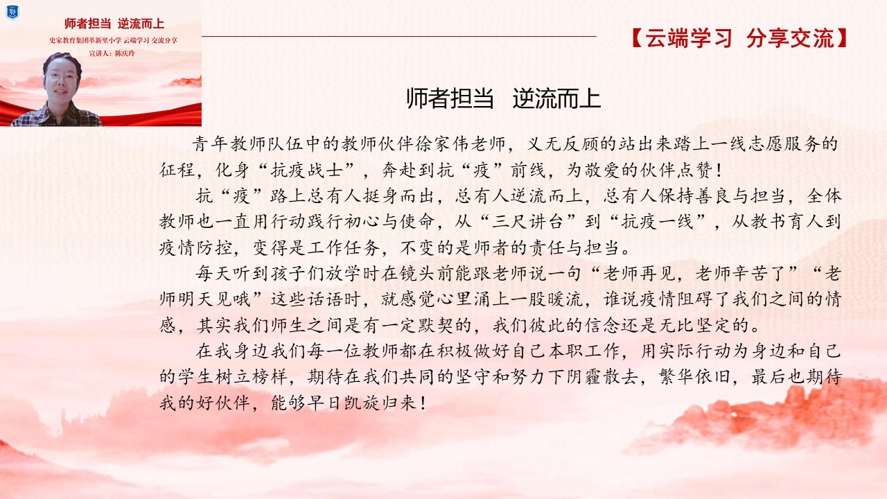 志愿者的心声,令人动容。我校青年抗疫先锋队成员徐家伟老师第一时间参与学习,朴实的语言打动了在场的所有教师,也更加坚定了大家认真落实疫情防控及线上教学的各项要求,坚决打好疫情防控攻坚战的决心。徐老师主动请缨,从线上教学转换角色到疫情防控的最前线,彰显了青年教师的责任和担当,用实际行动把思想汇报写在了“疫”线,接受党组织的考验。