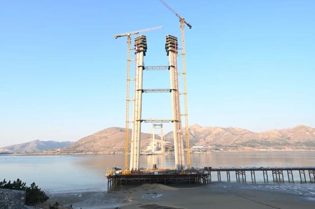 12月8号,G228丹东线乳山口大桥土建工程项目威海侧索塔塔柱完成封顶,工程建设取得突破性进展,标志着大桥建设将从下部结构转换至悬索桥上部结构施工。
