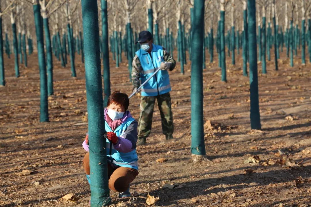 为了给过冬树木撑起“保护伞”,在树木进入生长的缓慢期和休眠期前,大兴区做好冬季修剪、冻水浇灌、防寒防盐、林地清理等工作,并采取盖地膜覆土、树木缠干、薄膜包裹等措施,减少因冻害造成的树干和枝杈皮裂、皮层坏死、根系冻伤等,确保树木安全越冬。