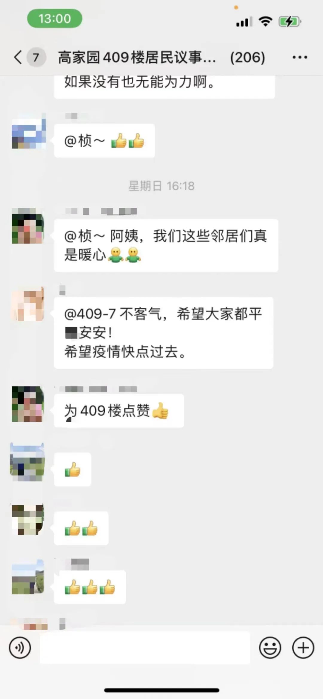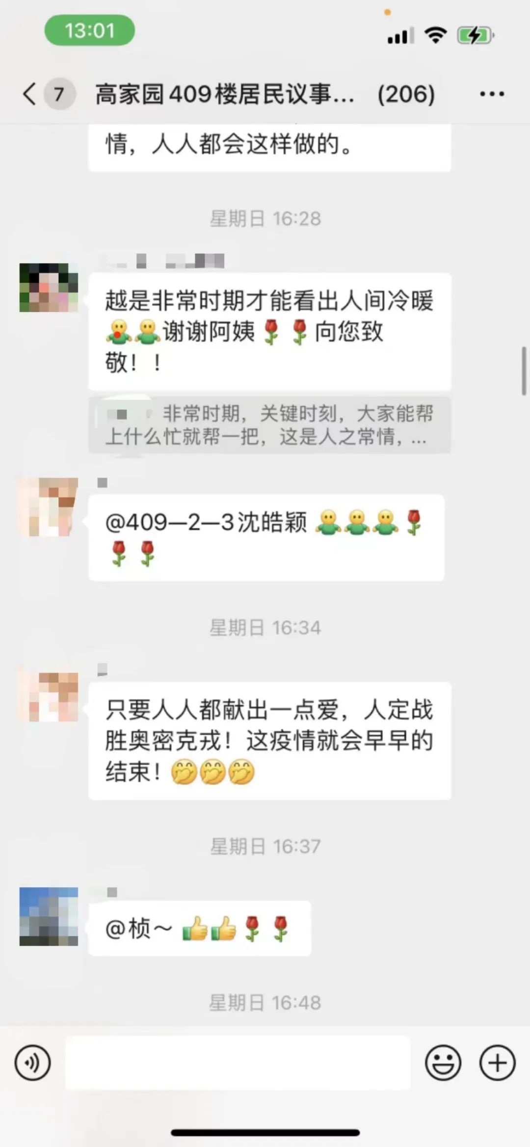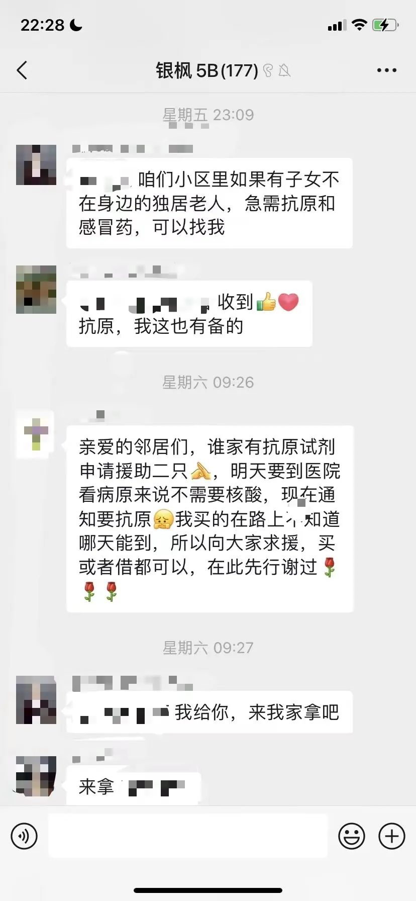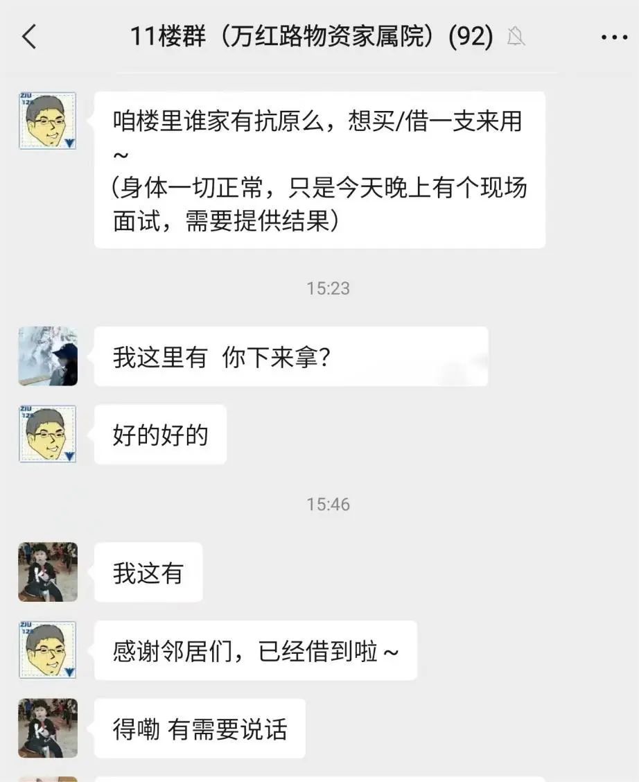 类似这样邻里互助,爱心接力的暖心事还有很多。楼上居民在群里发信息说急需抗原,楼下邻居立刻拿出家中备用分享;有居民问小区附近哪有消毒水可以购买,看到消息的邻居马上回复“我给你,来我家拿吧”;有居民发布“求药”信息,马上有人回复“我有”……战胜病毒的不止药物,更有居民们一颗颗互助的心!