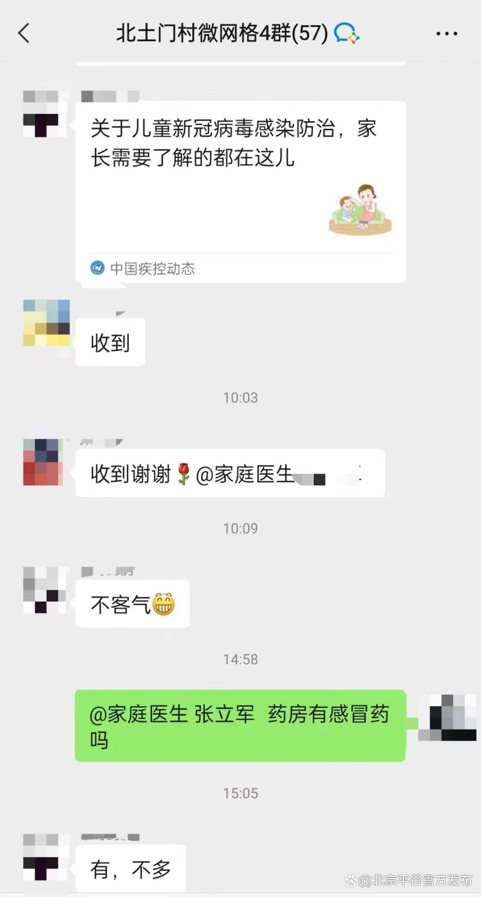 “最近疫情防控形势严峻,心里非常焦虑,不知道该如何科学防疫。”家住北土门村的郭女士说,“多亏了网格群里的家庭医生,线上解读政策并提供相关用药指导,让我心里一下子就有了底。”