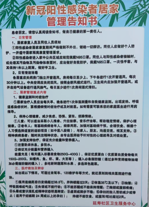 同时,制作了《新冠阳性感染者居家管理告知书》,为前来就诊的阳性感染者给予详细指导,尤其是面对老年人、孕产妇等群体时,更加关注患者情绪及身体情况,用通俗易懂的方式提供就医指导,给村民吃了一颗“定心丸”。