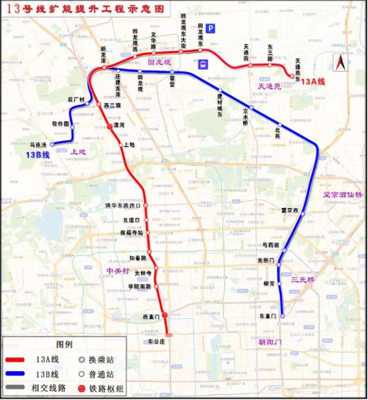 北京地铁13号线扩能提升工程是在老13号线的基础上进行扩能改造,线路拆分成13A、13B两条线路。13A线路长度31.3公里,线路起点车公庄,终点天通苑东,串联了既有13号线西段以及回龙观、天通苑地区。13B线路全长32.2公里,线路起点为16号线马连洼站,终点为13号线东直门站,串联了回龙观、天通苑以及老13号线东段。