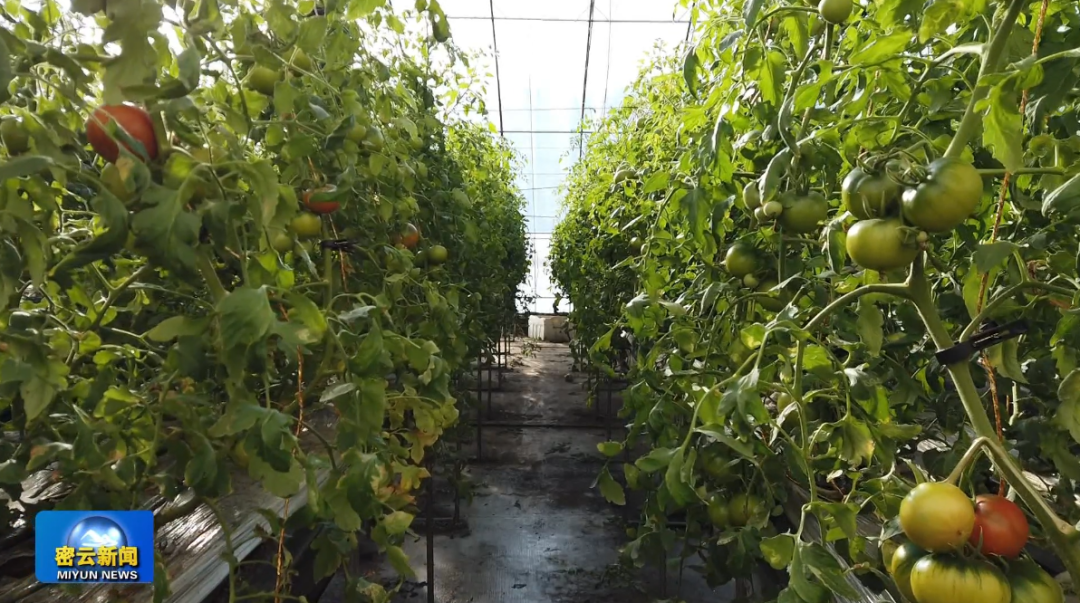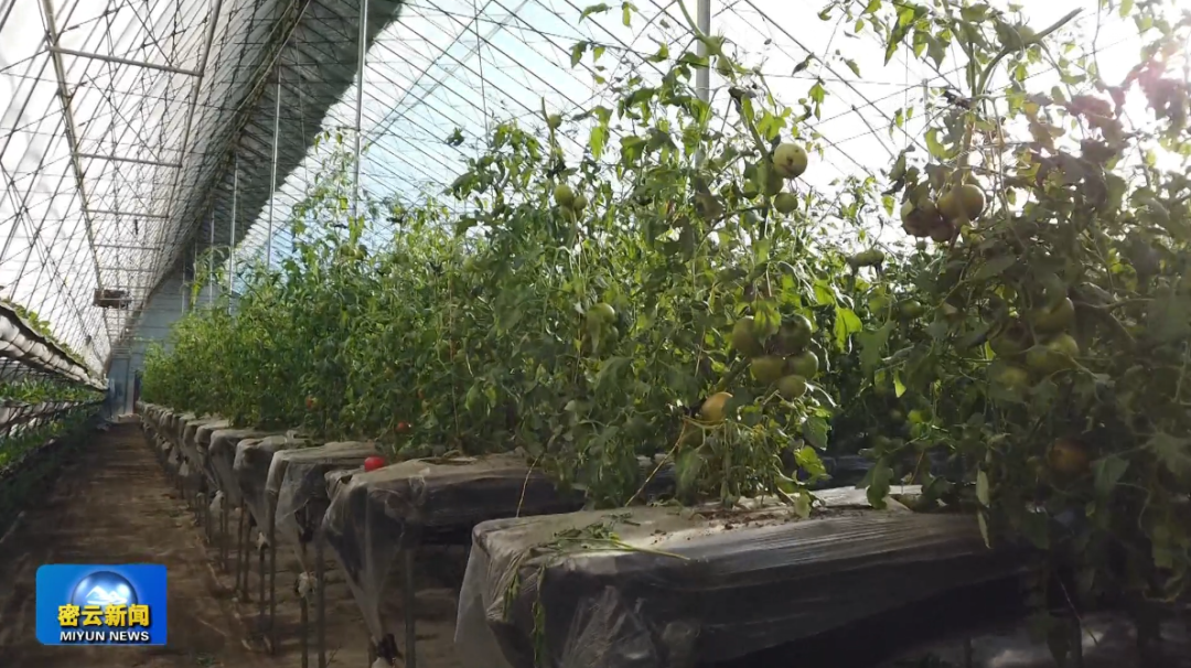 不远处的西红柿大棚里,饱满的西红柿挂满枝头,满眼丰收的景象。目前,沙峪里村共有16栋大棚采用无土栽培方式种植“京采六号”“原味一号”西红柿。