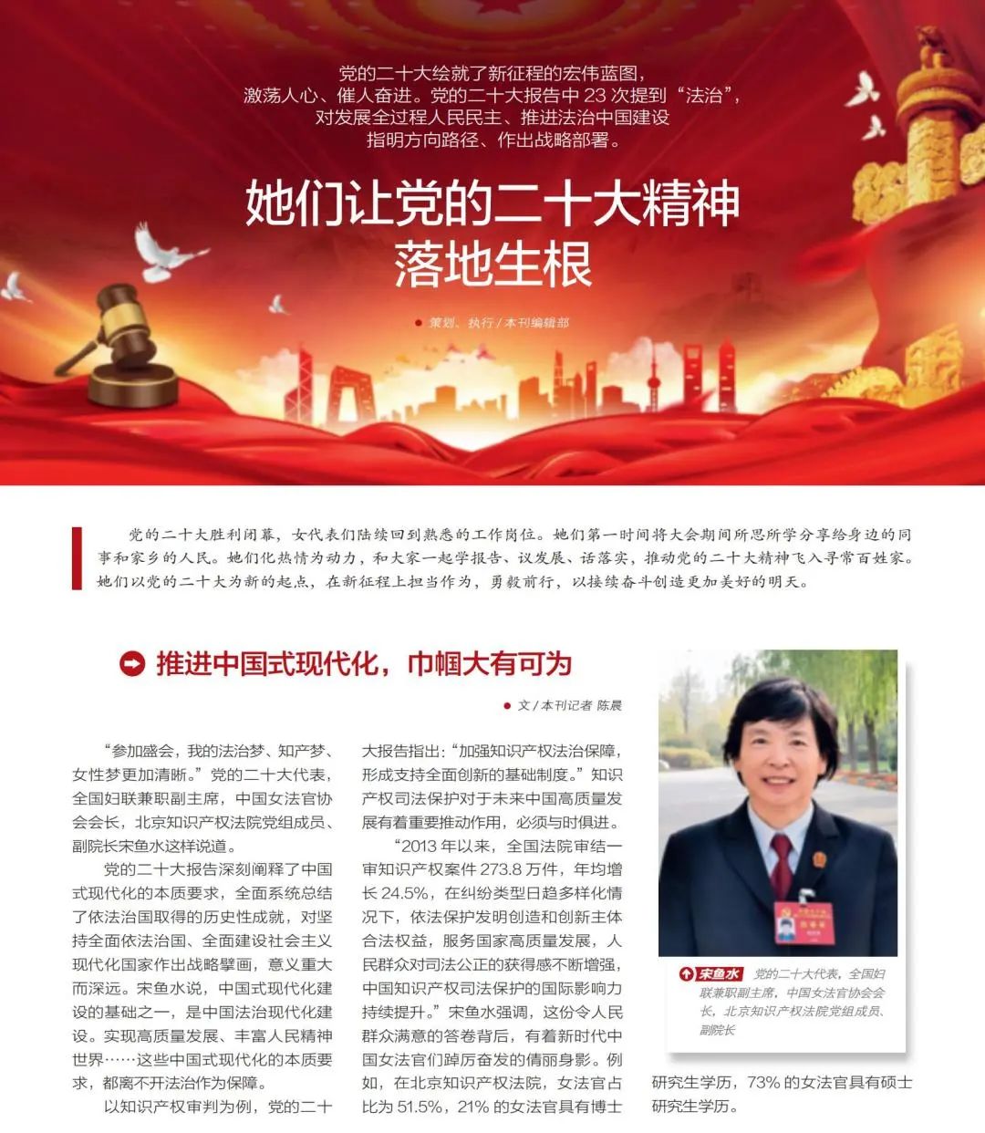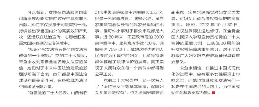 “知识产权女法官只是全国女法官群体的一个缩影。”党的二十大期间,宋鱼水收到来自全国各地女法官的微信,她们对于未来中国法治建设的殷殷期盼溢于言表,她们都是中国法治建设的最美奋斗者,在各领域为法治中国建设贡献力量。