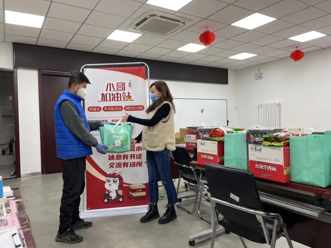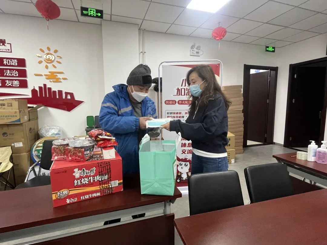 “这里有桶装面、火腿肠、保温杯,还有抗原检测试剂和口罩,最近天儿冷,你们一定注意身体!”在林肯公园社区“快递小哥暖心驿站”,考虑到快递员们近来因民生保供腿脚不歇,忙到连停下喝水的时间都没有,居委会工作人员按快递公司分类,联络京东、顺丰、中通等快递公司派一名快递员代表统一领取,并在发放物资时嘱咐大家做好自身防护。除了快递小哥,社区工作人员还将这批暖心福利同步送到社区底商水站的送水师傅、麦当劳外送员等群体手中。据统计,12月21日当天共计为40多位新业态从业者送上暖心物资包。