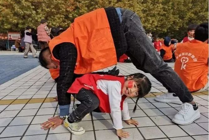 家长需要给孩子留出足够的高度,以便孩子能从身体下方爬过;家长还要在撑住身体的同时依次提腿。孩子转圈式的爬行需要他们进行全身性协调,并且根据家长的身体高度来调整自身身体姿势。