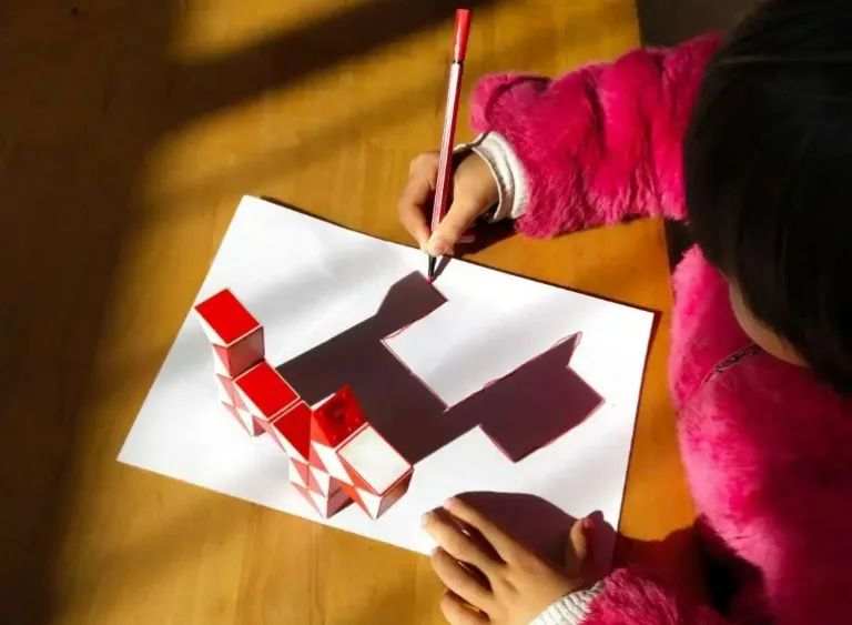 把孩子熟悉的玩偶(动物、人物)、物件(树叶、花朵)放在阳光下或台灯灯光下,让孩子仔细观察,用画笔描绘出光影的变化。这个游戏可以提升孩子的专注力和观察力,以及提升审美趣味。