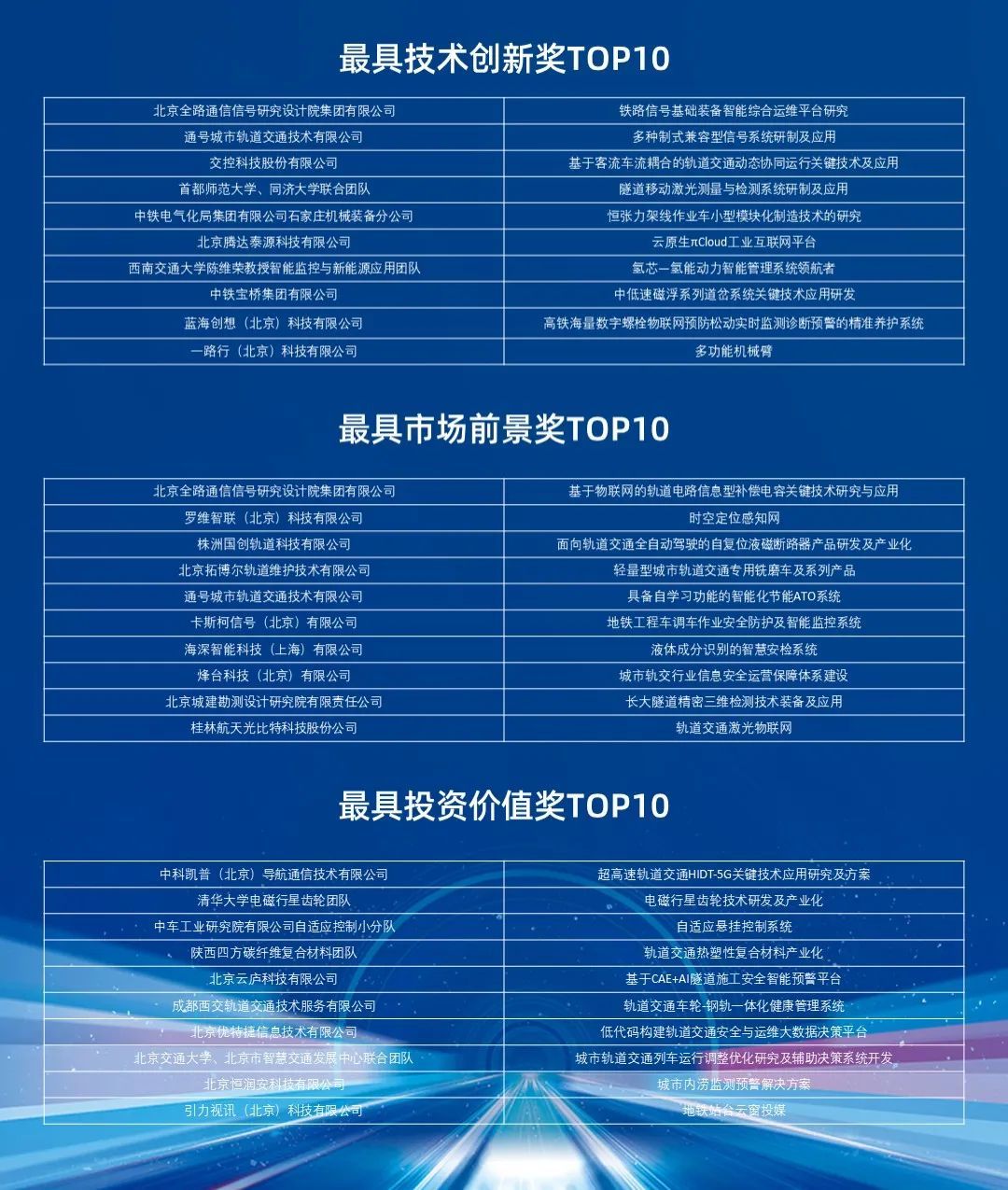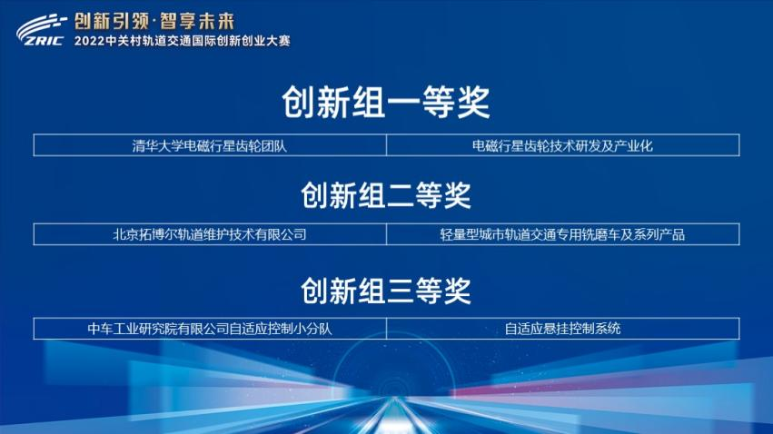 经过紧张激烈的角逐,最终评出创新组一等奖、二等奖、三等奖各1名,企业组一等奖1名、二等奖2名、三等奖3名,以及最具投资价值奖TOP10、最具技术创新奖TOP10、最具市场前景奖TOP10三类单项奖。其中清华大学电磁行星齿轮团队的“电磁行星齿轮技术研发及产业化项目”荣获创新组一等奖,北京全路通信信号研究设计院集团有限公司团队的“铁路信号基础装备智能综合运维平台研究项目”荣获企业组一等奖。