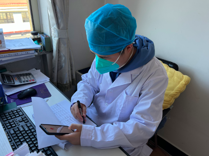 长哨营满族乡社区卫生服务中心家庭医生展亚男正在统计阳性感染者信息