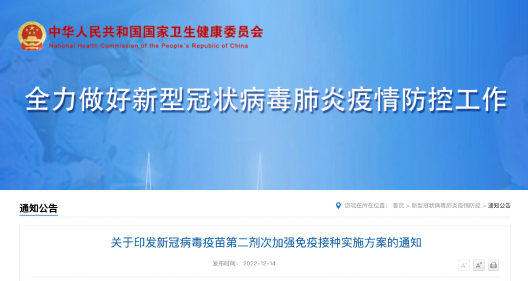 12月14日,国家卫健委官网发布《新冠病毒疫苗第二剂次加强免疫接种实施方案》。其中提到,现阶段,可在第一剂次加强免疫接种基础上,在感染高风险人群、60岁以上老年人群、具有较严重基础性疾病人群和免疫力低下人群中开展第二剂次加强免疫接种。