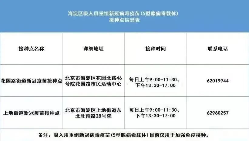 另外,海淀区共设有两个吸入用重组新冠病毒疫苗(5型腺病毒载体)接种点,分别是花园路街道新冠疫苗接种点及上地街道新冠疫苗接种点!