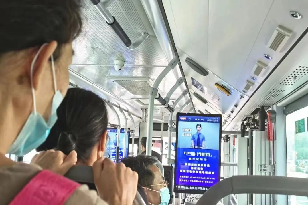 图为北京市检察机关原创的防范养老诈骗微动漫、微视频在公交车上播放