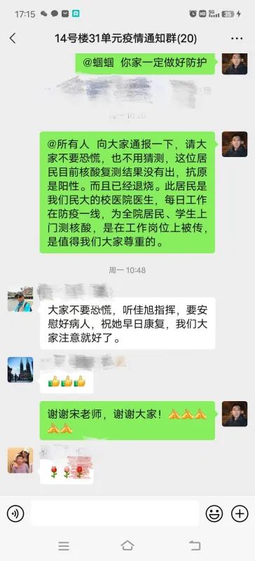 “前两天14号楼一家五口人发烧没药,我就在群里发消息,看谁家有,正好有一户人家剩了9粒布洛芬,我就把药取来,送给需要的那家人。”海淀区紫竹院街道民大社区工作人员张佳旭说道。